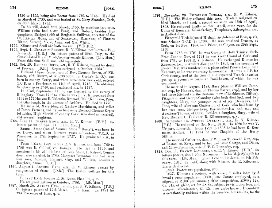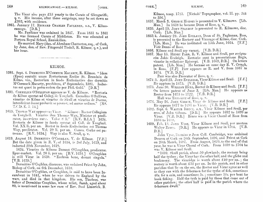 Case of disputed Glebe Lands at Crookhaven, West Cork c 1723, by Rector, Dr. Limerick, referes to Genealogy of Thadues Coughlan, his son Rev Dermitius Coughlan who fled 1641 from Cromwell his great grandson Jeremy (Jeremiah) Attorney and Irish Agent to Burlington Estate, on the road from Schull to Crookhaven ‘nor a bed a man can lie on nor a morsel to be eaten’, Henry Becher’s Fishing palace 1641, Captain William Hull with the wooden leg, Darby Mahony agent to Sir Richard Hull, Donagh McWilliam Coughlan proctor to Rev Thadeus Coughlan, Benjamin Sullivan Attorney Cork and East India Company Connections.