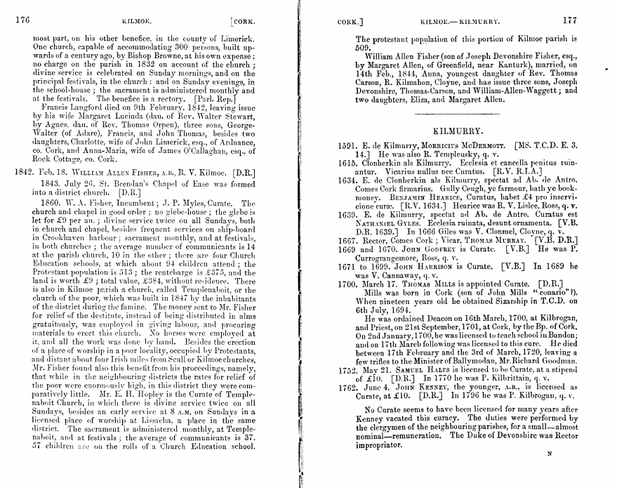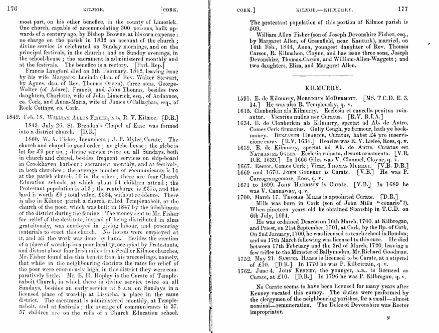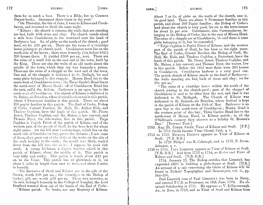 1700, Dives Downes on Kilmoe (Ballydehob/Schull/Crookhaven), West Cork, Lands Recently Forfeit by Coppinger and O’Mahony now Hull, Bishop of Cork, Colonel Beecher, Earl of Cork, in Crookhaven, Arthur Hyde, Thadeus Coghlan/Coughlan, Rectories College of Youghal control Wrested from Earl of Cork by Lord Strafford, Old Chapel at Kilkanget near Dunmanus Castle, In O’Sullivan Country Universally Observed as Festival St Roan’s Day, Tithes on Fishing, later Rev. Fisher, Teampall na mBocht.