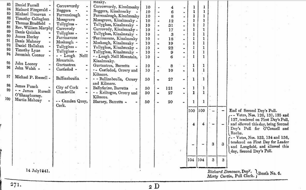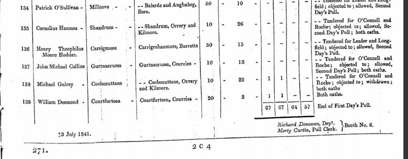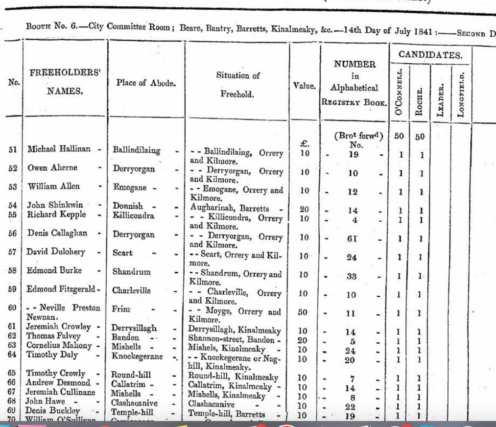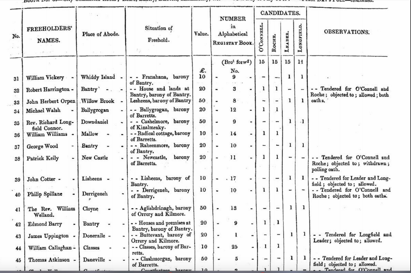 it is interesting that they largely did not vote for O’Connell as might have been expected. Looking at other elections such as that of Rickard Deasy the same patterns (not for them) is evident people you would expect to vote for a Catholic do not so so. Often tis may be because of family relationships, personal animosity or close relationships with the Head Landlord.