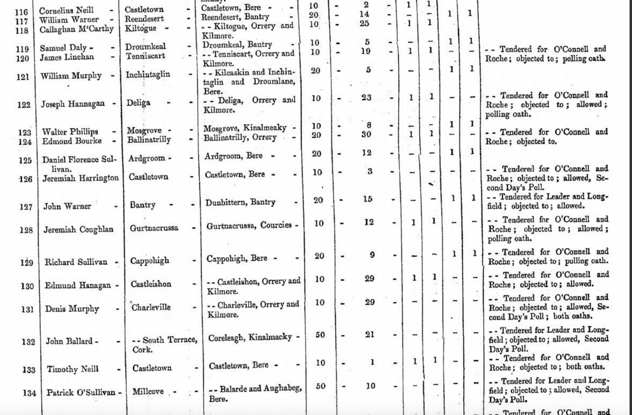1841 Election Petition including Barony of Bere and Bantry Co. Cork: Extended O’Sullivan Clan not Voting for Daniel O’Connell