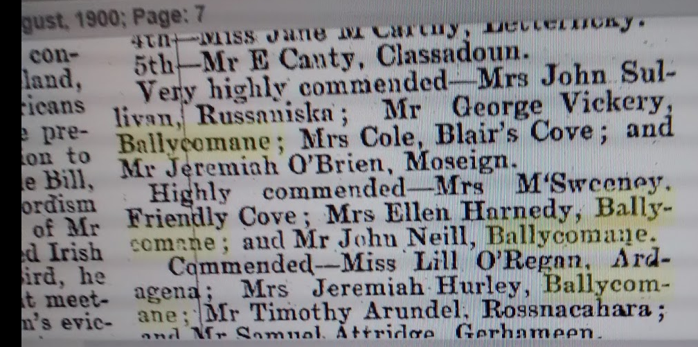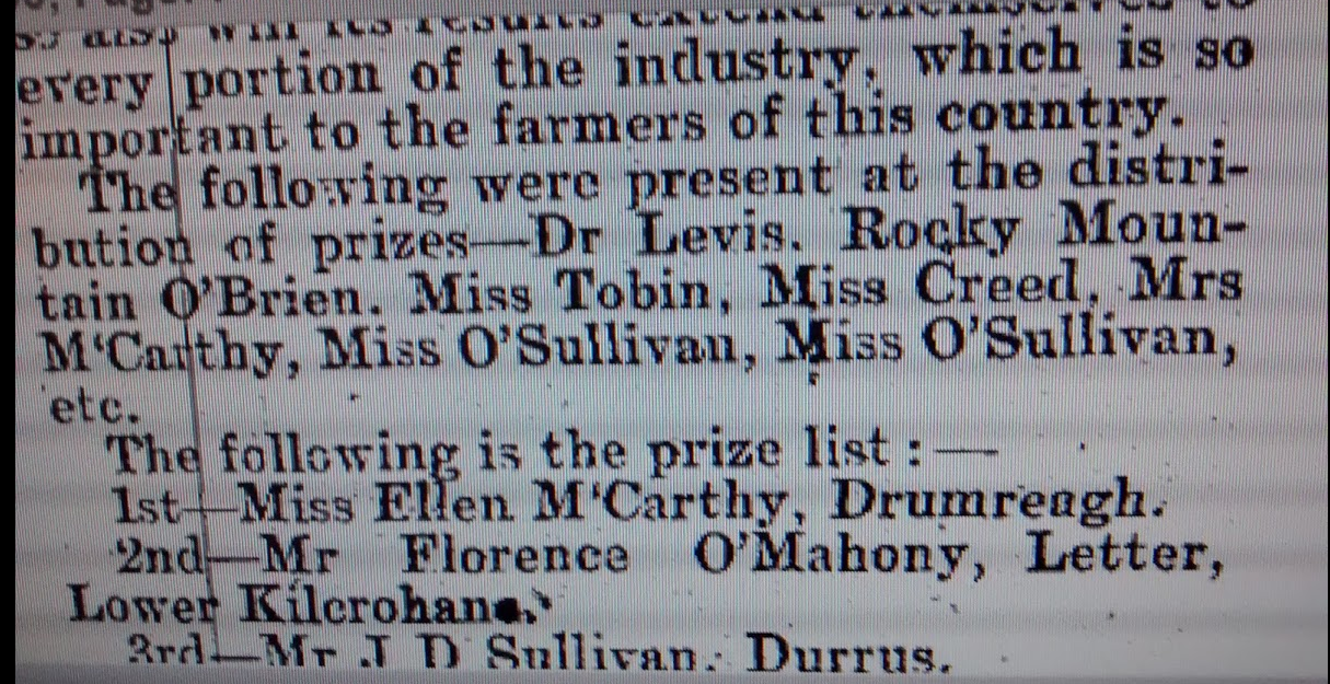 Munster Dairy Institute and Agricultural Institute, Itinerant Instructor Scheme, Butter Exhibition and Prizes August, 1900, Durrus, West Cork. Those present at Prize giving included Dr. Levis (his brother was rector both athletes), Rocky Mountain O’Brien, Miss Tobin (probably daughter of Richard Tobin art school graduate, grand daughter King Tobin, Kilcrohane), etc