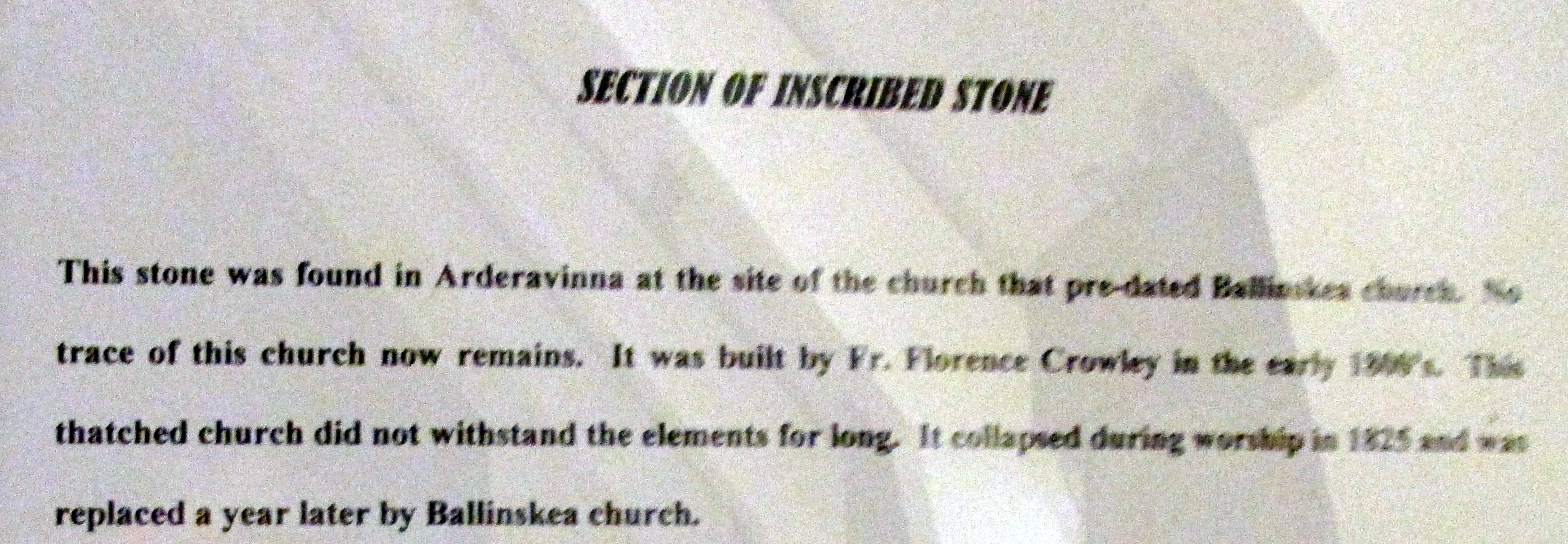 Arderavinna Thatched Catholic Church built by Father Florence Crowley, Collapsed 1825 During worship Replaced by Ballinasten Church Built by Father Michael Prior in use to 1966 when present Church at Lowertown, Schull, West Cork built