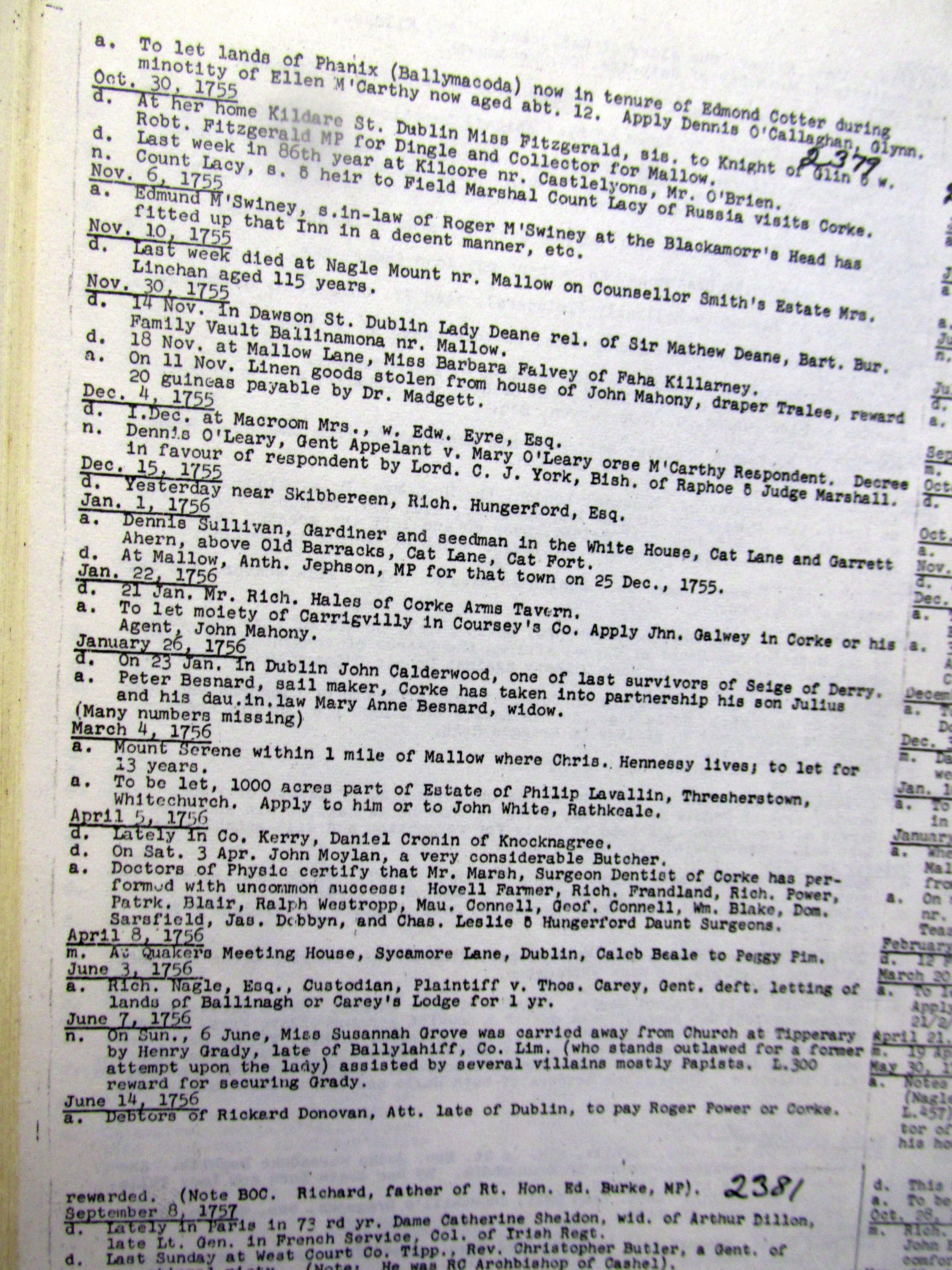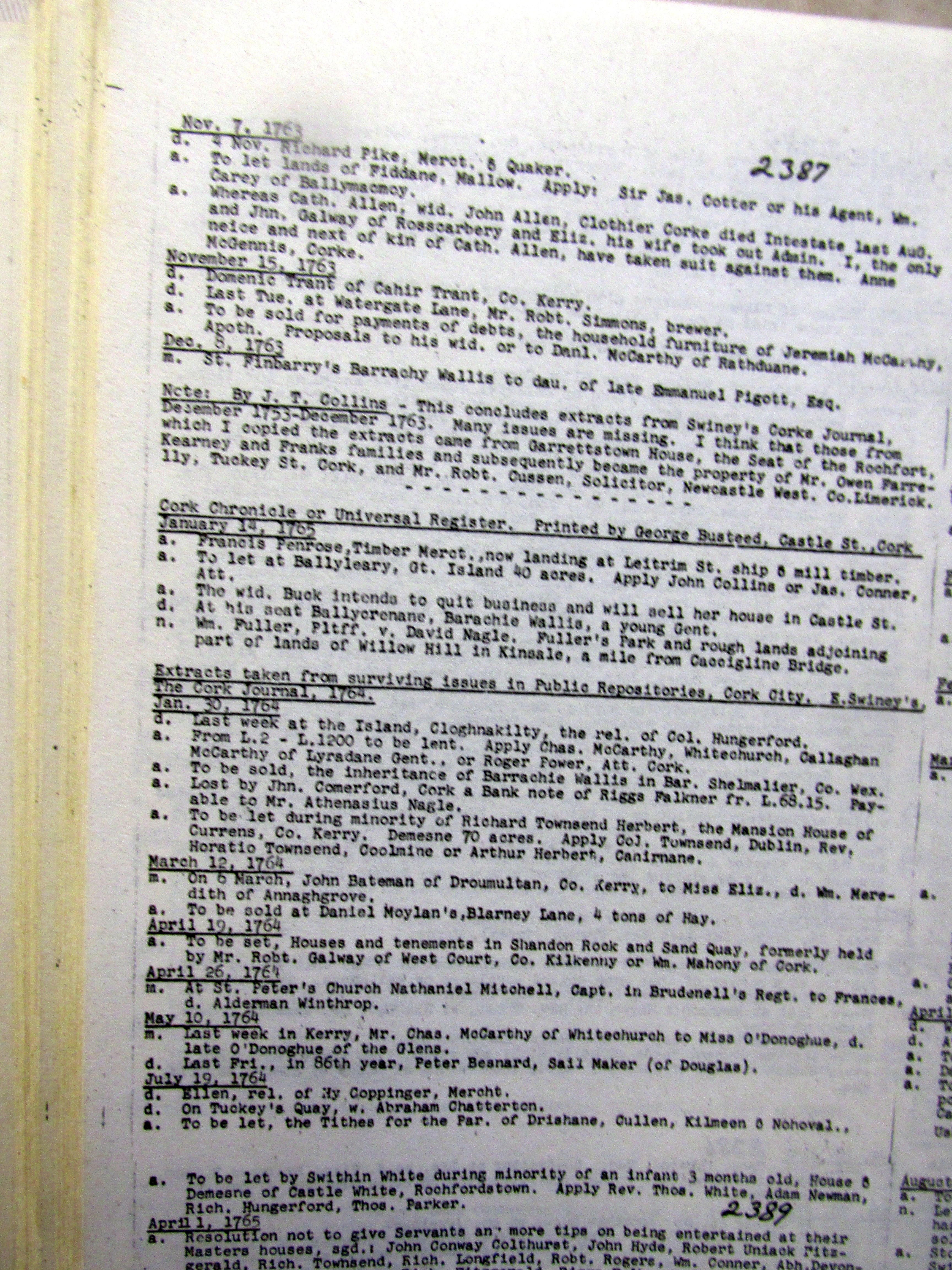 Some additional Cork Newspaper Extracts from 1754 of a Genealogical and Historical interest extracted by John T. Collins.