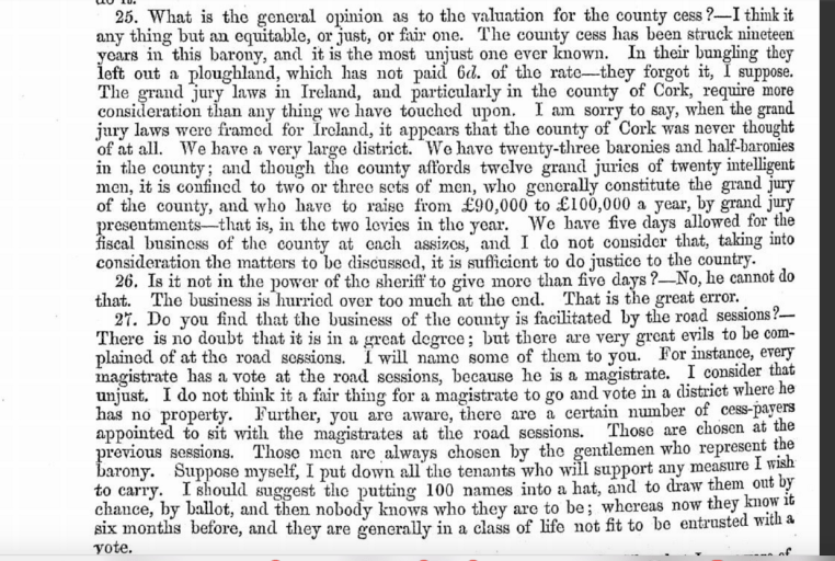 Parliamentary Commission on Land, Bantry, 1844, Evidence on Sub-Division, Rental Levels, Soil, Fertility, Bribery, Opression and Eviction by Lord Kenmare, Sbibbereen Agricultural Society, Bailiffs, Driving, Witnesses included Rev. Somers Payne, Land Agent, County Grand Master, Orange Order, Michael Murphy, Donemark, Formerly Farmer, Miller, Corn Agent, Richard White, Landlord Inchiclogh only Landlord to Give Leases in District, Samuel Hutchins, Landlords Ardnagashel, John O’Connell, Middleman, Rev. C. Freeman, Curate, Bantry.
