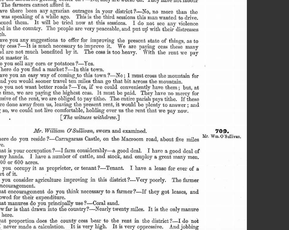 Parliamentary Commission on Land, Bantry, 1844, Evidence on Sub-Division, Rental Levels, Soil, Fertility, Bribery, Opression and Eviction by Lord Kenmare, Sbibbereen Agricultural Society, Bailiffs, Driving, Witnesses included Rev. Somers Payne, Land Agent, County Grand Master, Orange Order, Michael Murphy, Donemark, Formerly Farmer, Miller, Corn Agent, Richard White, Landlord Inchiclogh only Landlord to Give Leases in District, Samuel Hutchins, Landlords Ardnagashel, John O’Connell, Middleman, Rev. C. Freeman, Curate, Bantry.
