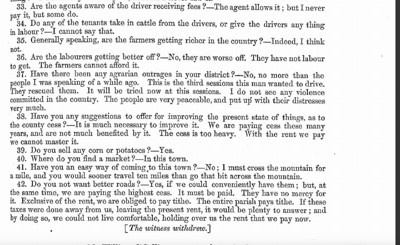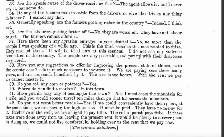 Parliamentary Commission on Land, Bantry, 1844, Evidence on Sub-Division, Rental Levels, Soil, Fertility, Bribery, Opression and Eviction by Lord Kenmare, Sbibbereen Agricultural Society, Bailiffs, Driving, Witnesses included Rev. Somers Payne, Land Agent, County Grand Master, Orange Order, Michael Murphy, Donemark, Formerly Farmer, Miller, Corn Agent, Richard White, Landlord Inchiclogh only Landlord to Give Leases in District, Samuel Hutchins, Landlords Ardnagashel, John O’Connell, Middleman, Rev. C. Freeman, Curate, Bantry.