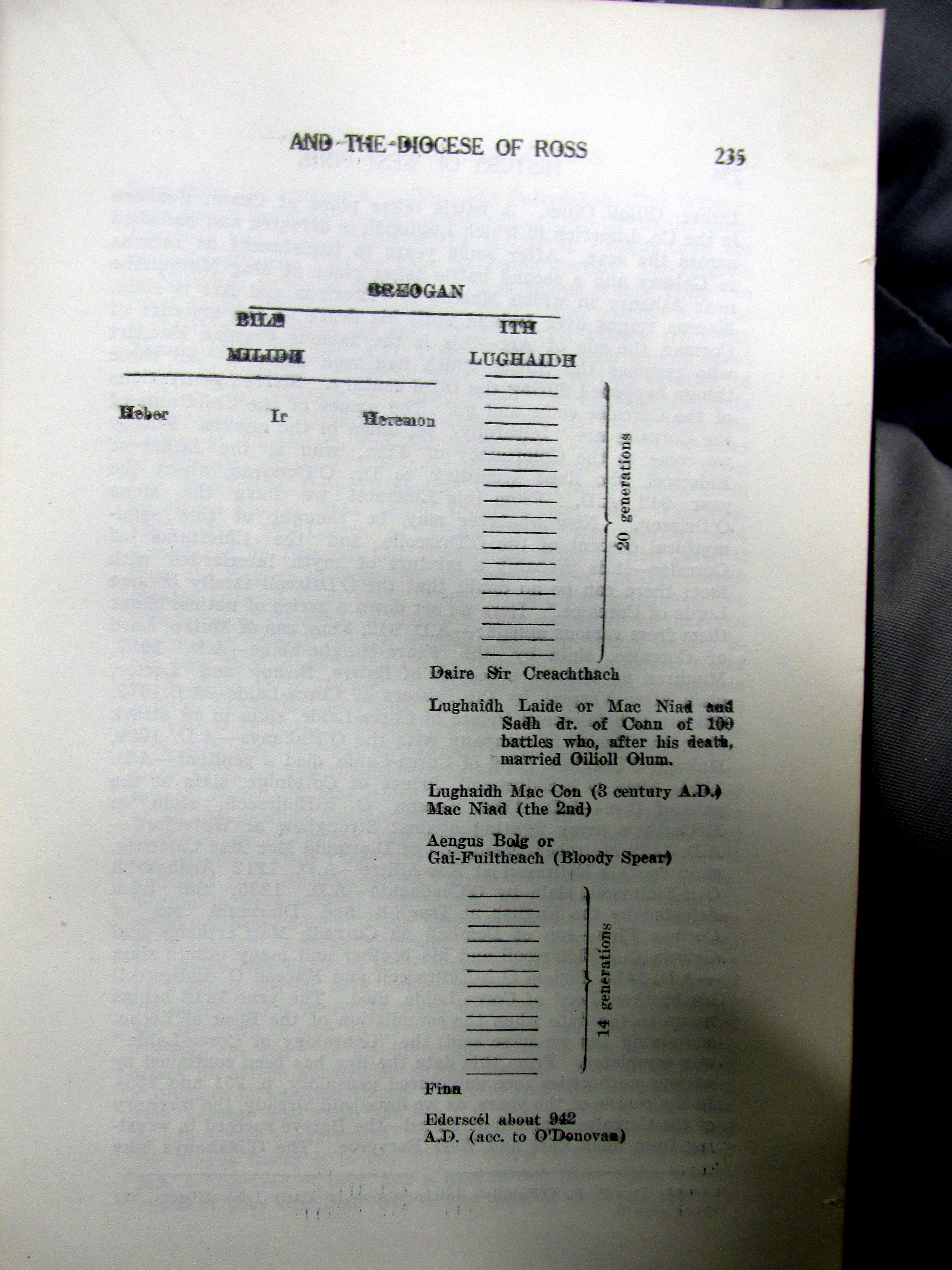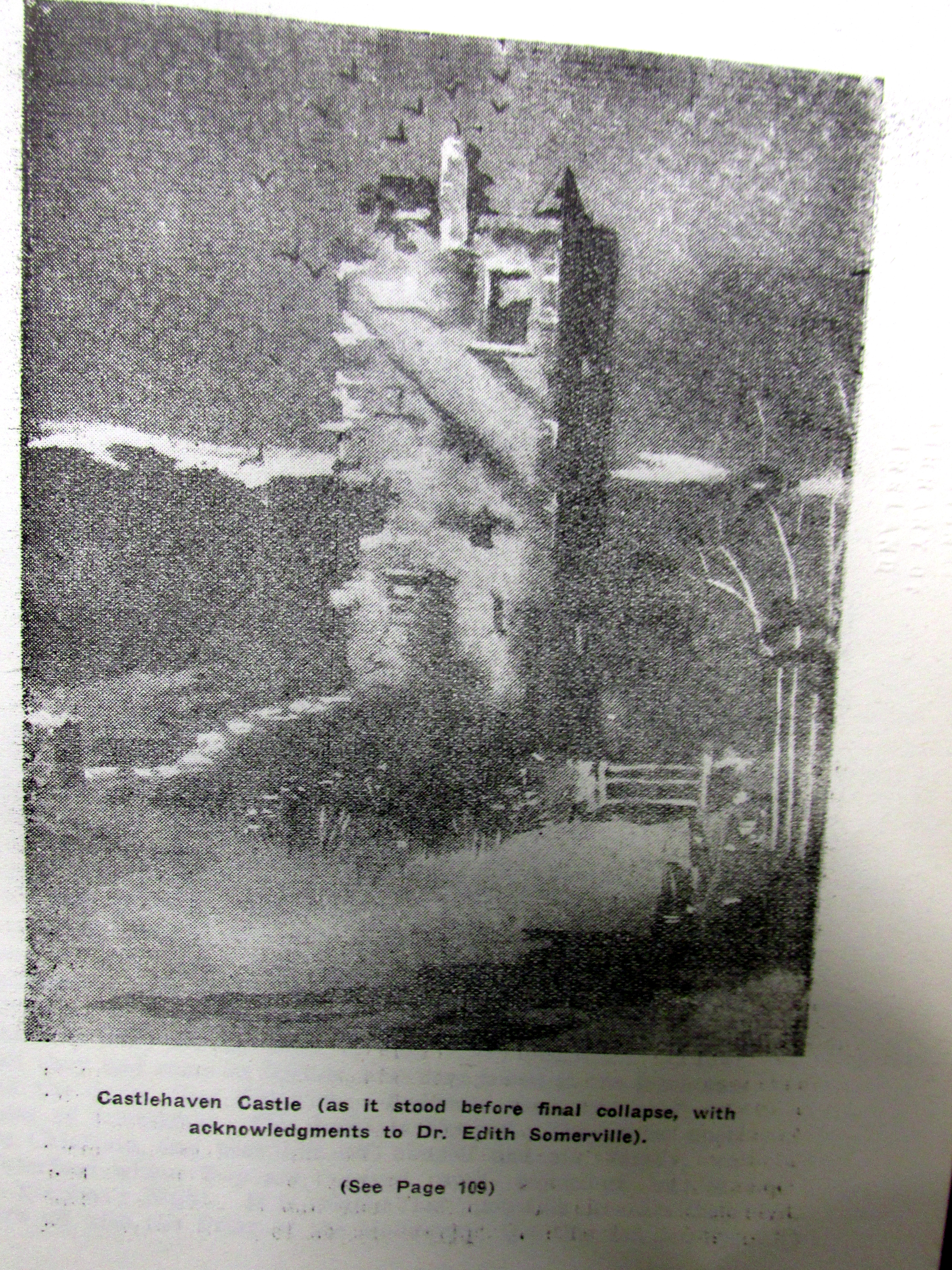 Genealogy of O’Driscoll family from Ederscél, 942 AD, with sketch of vanished Castlehaven Castle by Edith Somerville.