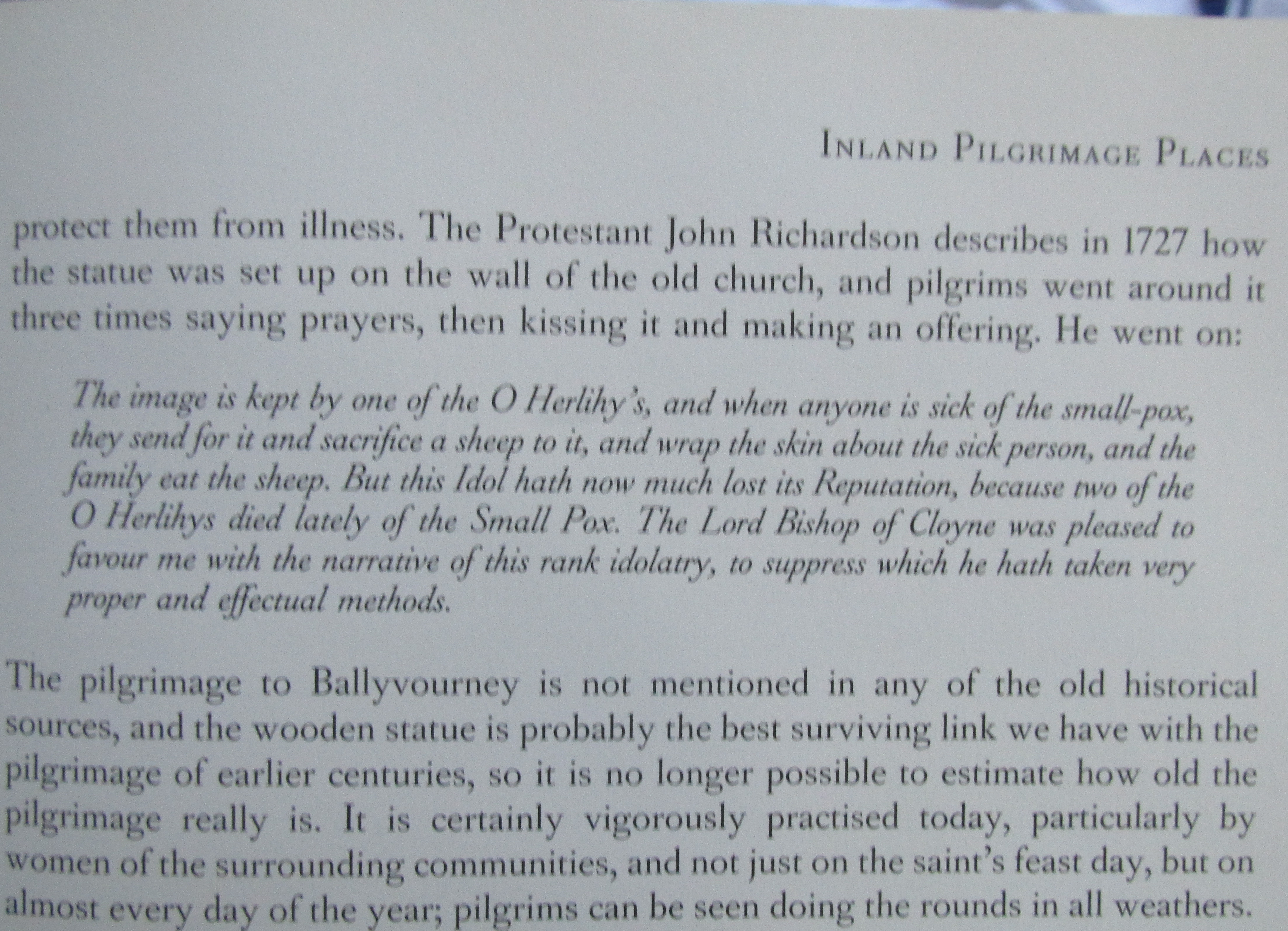 The Reverend John Richardson, Rector of Belturbet, Co. Cavan, author of ‘The Great Folly, Superstition and idolatry of Pilgrimages in Ireland, Especially of that to St. Patrick’s Purgatory, together With an Account of the Loss that the public Sustaineth thereby, truly and impartially Represented his account at Ballyvourney, Co. Cork, 1727 of 13th century wooden statue of St. Gobnait (Patroness of Bee Keepers) as an antidote to small pox being kept by the O’Herlihys.