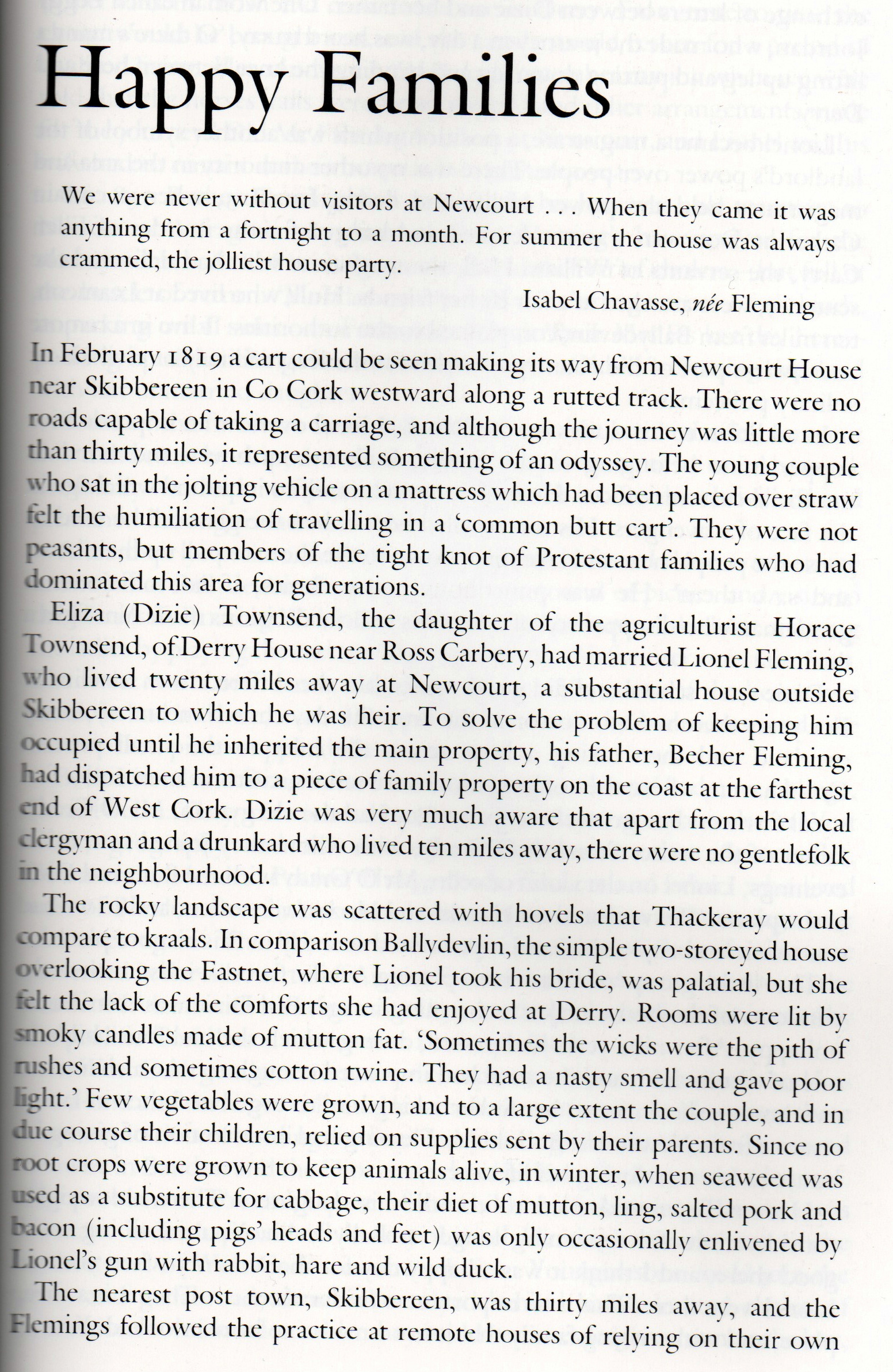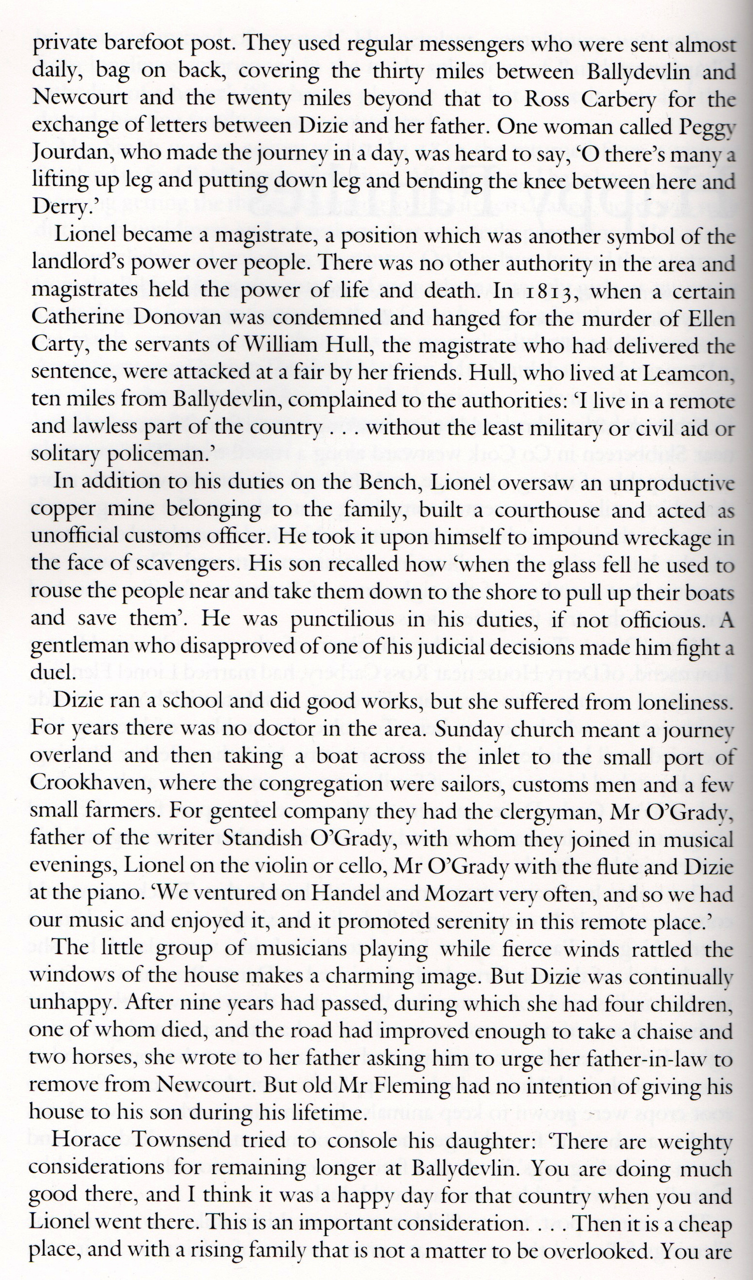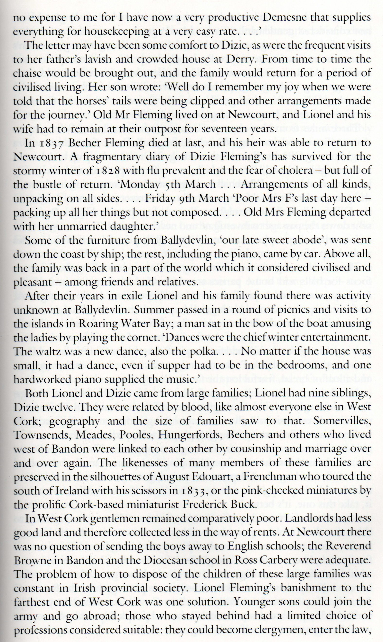 Notes for Eliza Townsend (Dizzie) Married 10 January 1819. Lionel John Fleming (1) of Newcourt (2) was the son of Becher Fleming (1760-1837) of Newcourt (3), Co Cork and a barrister. Lionel’s grandmother was Mary Townsend [506] who married Thomas Somerville of Castlehaven. Lionel’s sister, Martha Fleming, married John Sealy Townsend [333]. See 1958 Edn Burke’s Irish Family Records – Fleming. Dizzie attended school at Clifton, Bristol ca 1807 with her sister Katherine Townsend [5D06]. According to the book “The Irish Country House” by Peter Somerville-Large, Lionel’s father sent the couple after their marriage to Ballydevlin House, near Goleen on the north side of Roaring Water Bay, in order to keep Lionel occupied until he inherited the Newcourt estate. The entry for the parish of Kilmoe in Samuel Lewis’ Topographical Dictionary of Ireland 1837 reflects this. Life at Ballydevlin was very basic and all supplies had to come from Skibbereen, thirty miles away, and the couple found themselves very isolated. Although she ran a school and helped the poor, Dizzie found life at Ballydevlin very lonely compared with the hustle and bustle of Derry and implored her father to persuade her father-in-law to relinquish the Newcourt estate in favour of Lionel. This cut no ice and it was not until 1837 that Lionel inherited the estate.
