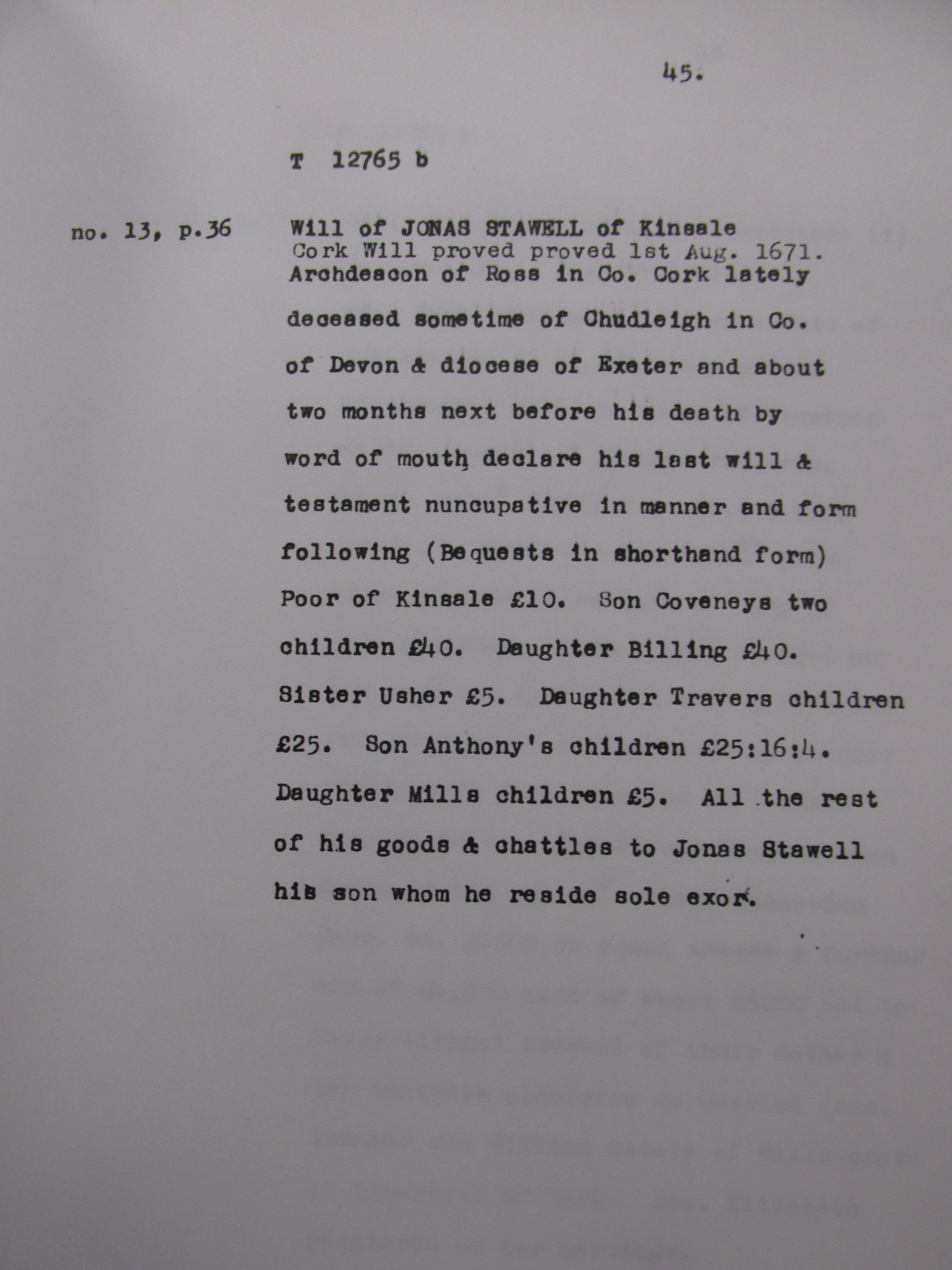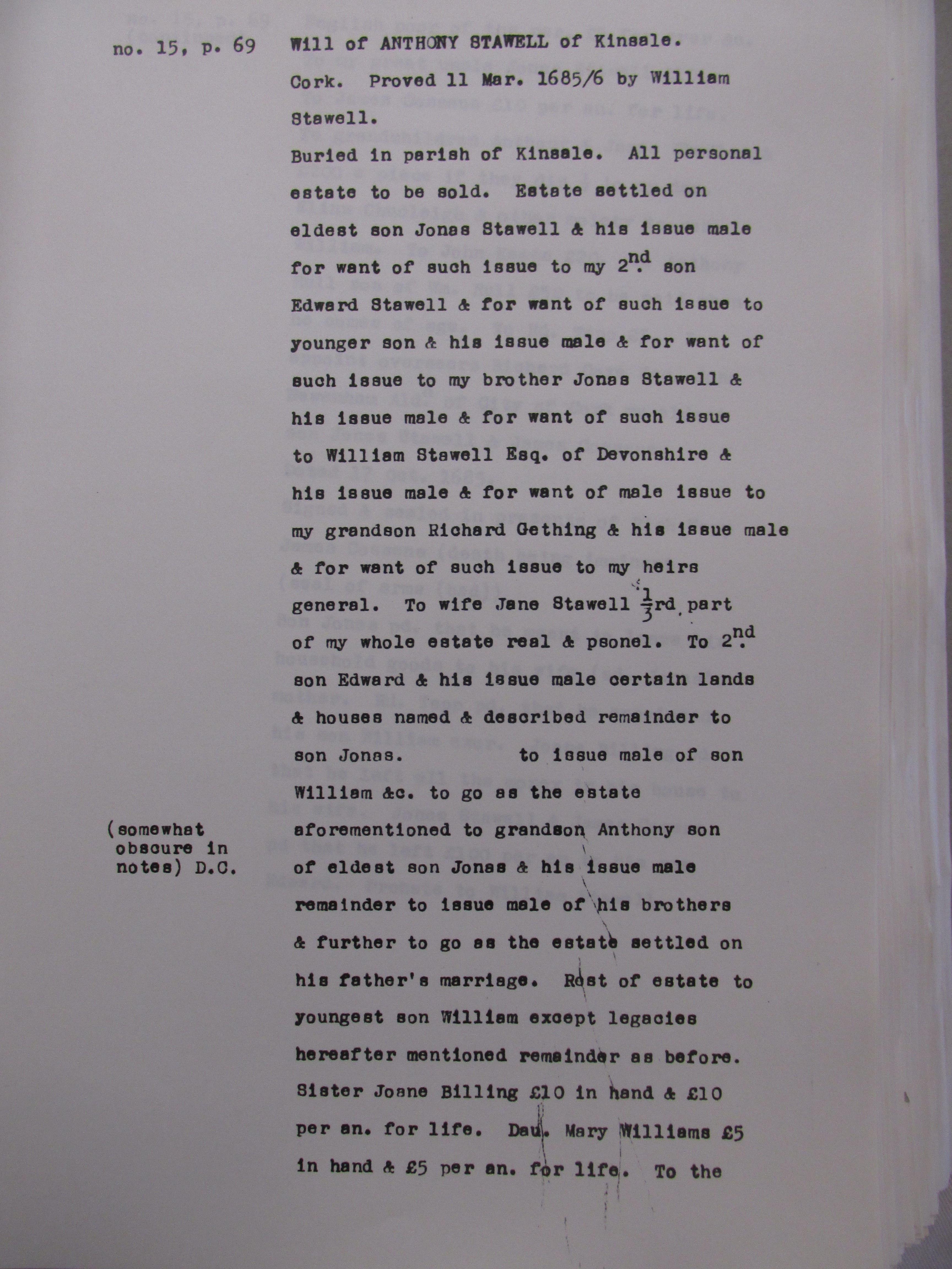 Wills associated with the Stawell family, Kinsale, Co.Cork from the 1690s. The Stawells were a Landed family associated with the Kinsale area. Among names mentione , Travers, Bldwin, Crone, Aldworth, Allen, Cox, Hull, Spiller, Chudlegh, Keefe/O’Keeffe, Mills, Nagle, O’Riordan, Rice.