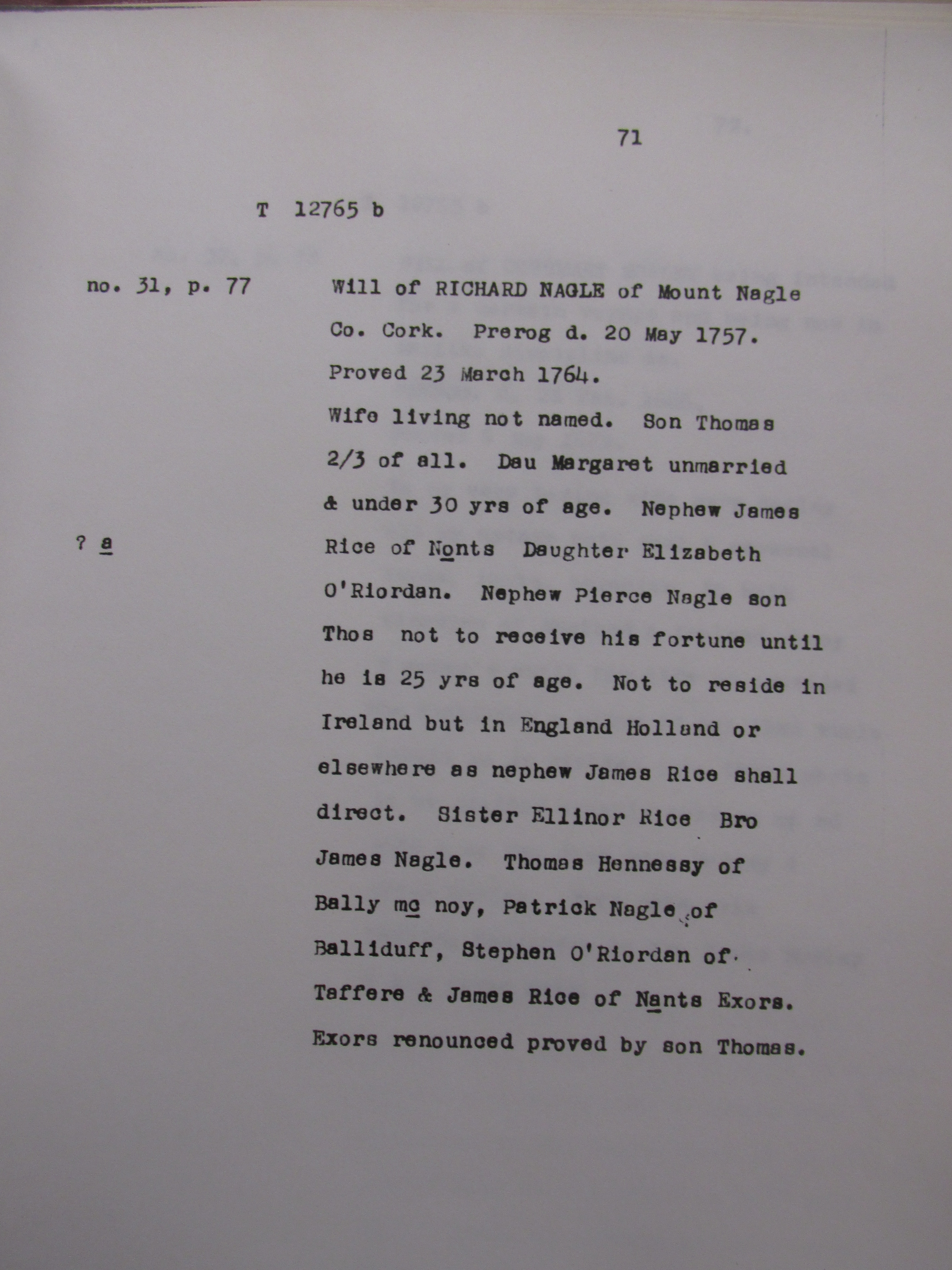 Thomas Minhear, 1864, Raleigh, Macroom, Non-Resident, £90