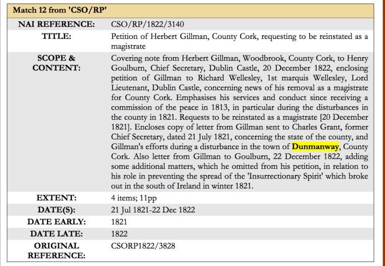 1822 Petition of Joshua H Cox, Manor House, Dunmanway for continuance of Mother’s Pension of £200 Mentions Favourable Treatment of French Officers in 1796, French Officers on Parole entertained at Balls, Petition of Herbert Gillman, Woodbrook, Dunmanway, to be Re-Instated as Magistrate, Mentions his Role in preventing Spread of the ‘Insurrectionary Spirit’ in the South of Ireland in the Winter of 1821, Other Baldwin Magistrates, Co. Cork.