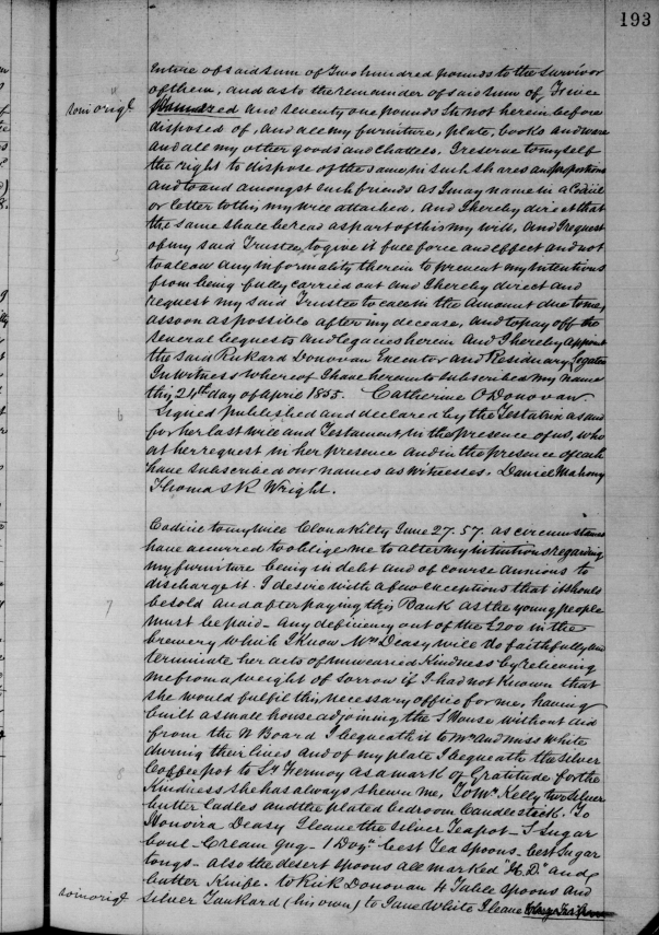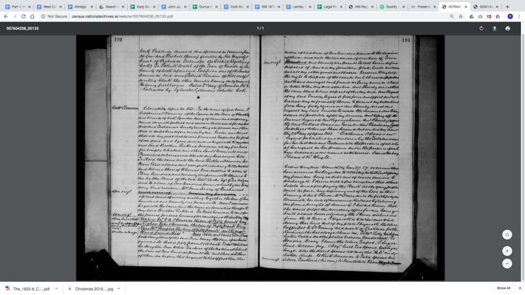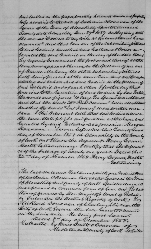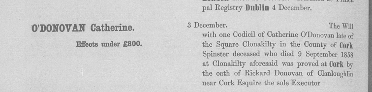 Richard/Rickard Donovan (1799-1883), Lisheens, Ballincollig, listed 1838, Clerk of the Crown (State Solicitor)  for Co. Cork from 1838, son of Dr. Donovan and Ann Deasy daughter of Timothy Deasy first Catholic J.P. since the Treaty of Limerick.   Brother Alexander Judge in Jamaica in 1842. Grand son of Alexander O’Donovan of Squince, in the Parish of Myross was the Head of Clann Lochlain, second in seniority to Clann Cathail.  Clonakilty.  1870, listed Mount Desert, 15 acres. Probate to Denis McCarthy Gallivey (should be Galwey), Greenfield, Clonakilty, £10,164.