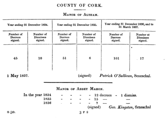 Returns of Cork Manor Courts by Seneschals of Altam (Beara), Abbey Mahon (Timoleague), Ballymodan (Bandon), Bantry, Bridgetown (Skibbereen), Castlemahon/Castlebernard (Bandon), Castlemartyr, Charleville, Clonakilty, Dunmanway, Inchiquin (Midleton), Lemcon (Schull), Mallow, Newmarket, Newcastle and Garricloyne (Cork may be Bishop of Cork’s Manor Court of St. Finbarrs).