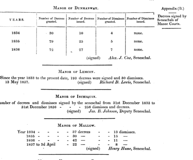 Returns of Cork Manor Courts by Seneschals of Altam (Beara), Abbey Mahon (Timoleague), Ballymodan (Bandon), Bantry, Bridgetown (Skibbereen), Castlemahon/Castlebernard (Bandon), Castlemartyr, Charleville, Clonakilty, Dunmanway, Inchiquin (Midleton), Lemcon (Schull), Mallow, Newmarket, Newcastle and Garricloyne (Cork may be Bishop of Cork’s Manor Court of St. Finbarrs).