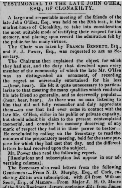 Testimonial of John O’Hea, Esq., Died Clonakilty, Co. Cork, 1847. Included Thomas Allen, JP, Allin and Co Shannonvale (Mills?), James Redmond Barry Fishery Commissioner JP Glandore, W.J.F. Barry son of Redmond Glandore, Rev. J. Beamish Kilmalooda, Francis Bennett Clonakilty, William Bennett Clonakilty, John Callaghan Clonakilty, Daniel Clanchy, JP, Charleville, John Coghlan Clonakilty, James Comyn Cobh, C. Connell and Co Ballinascarty, J.Nelson Crofts Clonakilty, Eyre Croke Croker Ballyra, Thomas Deasy Clonakilty, Patrick Desmond Clonakilty, Richard Dennehy, John Donovan Clonakilty, Jeremiah Donovan brother of Rickard Midleton, Rickard Donovan, Clerk of Crown (State Solicitor) Cork, Joseph Dugan Clonaakilty, William Ffolliott, M.D. Clonakilty, Henry Franks Clonakilty, Alexander Grant Clonakilty, P.B. Grifin, G.F.Hardy Cork, Miss Anne Gallwey Kilkerran, Charles Gallwey Kilcoleman, Michael Gallwey JP KIlkieran House, Henry Gallwey Greenfield, William Gallwey Kilcoleman, Major Hill Late 54th Regiment Clonakilty, Daniel Kelly Clonakilty, M. Irwin Clonakilty, J.E Lucas Ring Clonakilty, Dr. Lucas Richsfordstown, O.H.Marmion, Skibbereen, Nicholas Daniel Murphy Solicitor Cork, Major J.H.O. Moore, 35th Regiment Jersey, Daniel McCarthy Skibbereen, John McCarthy Clonakilty, T. McCarthy Downing Solicitor, Skibbereen, Richard Boyle Norcott Skibbereen, F.J. Power Bank Manager Clonakilty, Rev. J. Quarry, Clonakilty, Patrick Scott Dublin, William Scott Mamore House, Rev. Henry Stewart Rathbarry, James Sweeny Clonakilty, Daniel Sullivan Clonakilty, James Toohig Clonakilty, Winispeare Toye Clonakilty, T.R. Wright Solicitor Clonakilty.