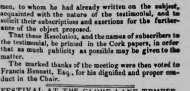 Testimonial of John O’Hea, Esq., Died Clonakilty, Co. Cork, 1847. Included Thomas Allen, JP, Allin and Co Shannonvale (Mills?), James Redmond Barry Fishery Commissioner JP Glandore, W.J.F. Barry son of Redmond Glandore, Rev. J. Beamish Kilmalooda, Francis Bennett Clonakilty, William Bennett Clonakilty, John Callaghan Clonakilty, Daniel Clanchy, JP, Charleville, John Coghlan Clonakilty, James Comyn Cobh, C. Connell and Co Ballinascarty, J.Nelson Crofts Clonakilty, Eyre Croke Croker Ballyra, Thomas Deasy Clonakilty, Patrick Desmond Clonakilty, Richard Dennehy, John Donovan Clonakilty, Jeremiah Donovan brother of Rickard Midleton, Rickard Donovan, Clerk of Crown (State Solicitor) Cork, Joseph Dugan Clonaakilty, William Ffolliott, M.D. Clonakilty, Henry Franks Clonakilty, Alexander Grant Clonakilty, P.B. Grifin, G.F.Hardy Cork, Miss Anne Gallwey Kilkerran, Charles Gallwey Kilcoleman, Michael Gallwey JP KIlkieran House, Henry Gallwey Greenfield, William Gallwey Kilcoleman, Major Hill Late 54th Regiment Clonakilty, Daniel Kelly Clonakilty, M. Irwin Clonakilty, J.E Lucas Ring Clonakilty, Dr. Lucas Richsfordstown, O.H.Marmion, Skibbereen, Nicholas Daniel Murphy Solicitor Cork, Major J.H.O. Moore, 35th Regiment Jersey, Daniel McCarthy Skibbereen, John McCarthy Clonakilty, T. McCarthy Downing Solicitor, Skibbereen, Richard Boyle Norcott Skibbereen, F.J. Power Bank Manager Clonakilty, Rev. J. Quarry, Clonakilty, Patrick Scott Dublin, William Scott Mamore House, Rev. Henry Stewart Rathbarry, James Sweeny Clonakilty, Daniel Sullivan Clonakilty, James Toohig Clonakilty, Winispeare Toye Clonakilty, T.R. Wright Solicitor Clonakilty.