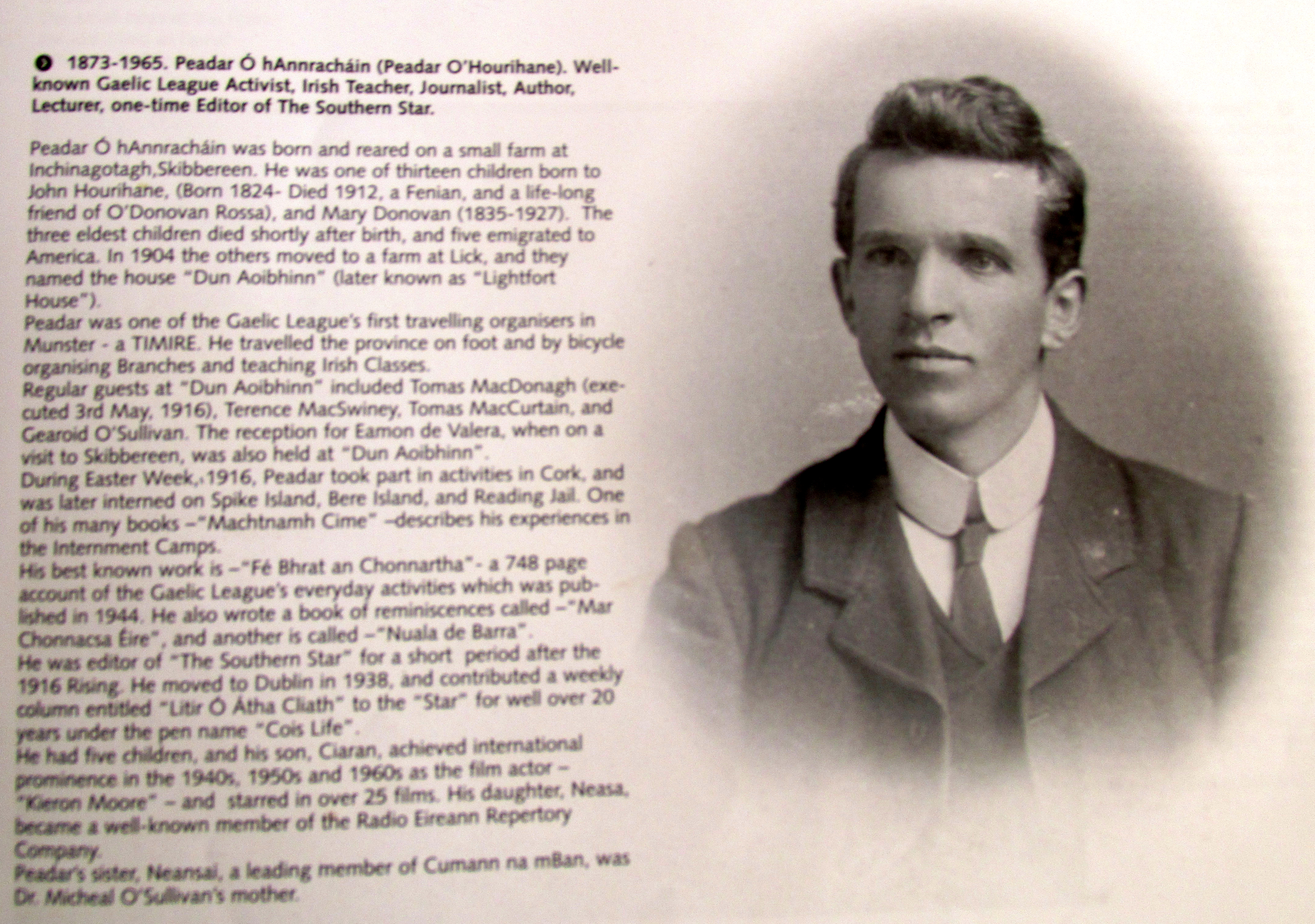 Re Peadar Ó hAnnracháin. Peadar was a wonderful Conradh na Gaeilge organiser throughout a number of counties including Cork and he wrote several books as Gaeilge. He also wrote on the Southern Star as ‘Cois Life’ in the 1940s and 1950s. The column often wandered over long lost history, family relationships and there was a touch of the ‘Seanachaí’ about them.