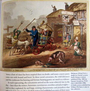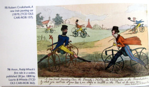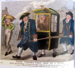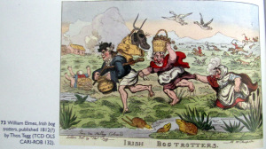 Caricatures of the Irish in London Press early 19th century: Irish Bog Trotters 1812, Posting in Ireland 1805, A New Irish Jaunting Car 1819, Paddy Whack’s First Ride In a Sedan 1800, The Scare crows Arrival or Honest Pat Giving Them an Irish welcome 1803.