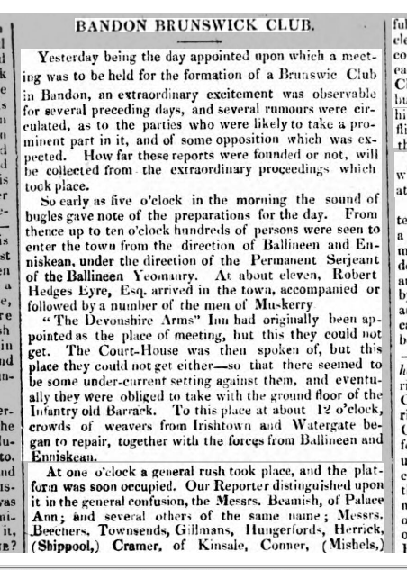 1828. Formation of Bandon Co. Cork Brunswick Constitutional Club, Orangemen Chiefly Cotton Weavers, Attack Catholics at the Meeting, and References to Ibane/Barryroe and Macroom Brunswick Clubs. 29 Friday Apr 2016 Original size at 452 × 633 ≈ Leave a comment