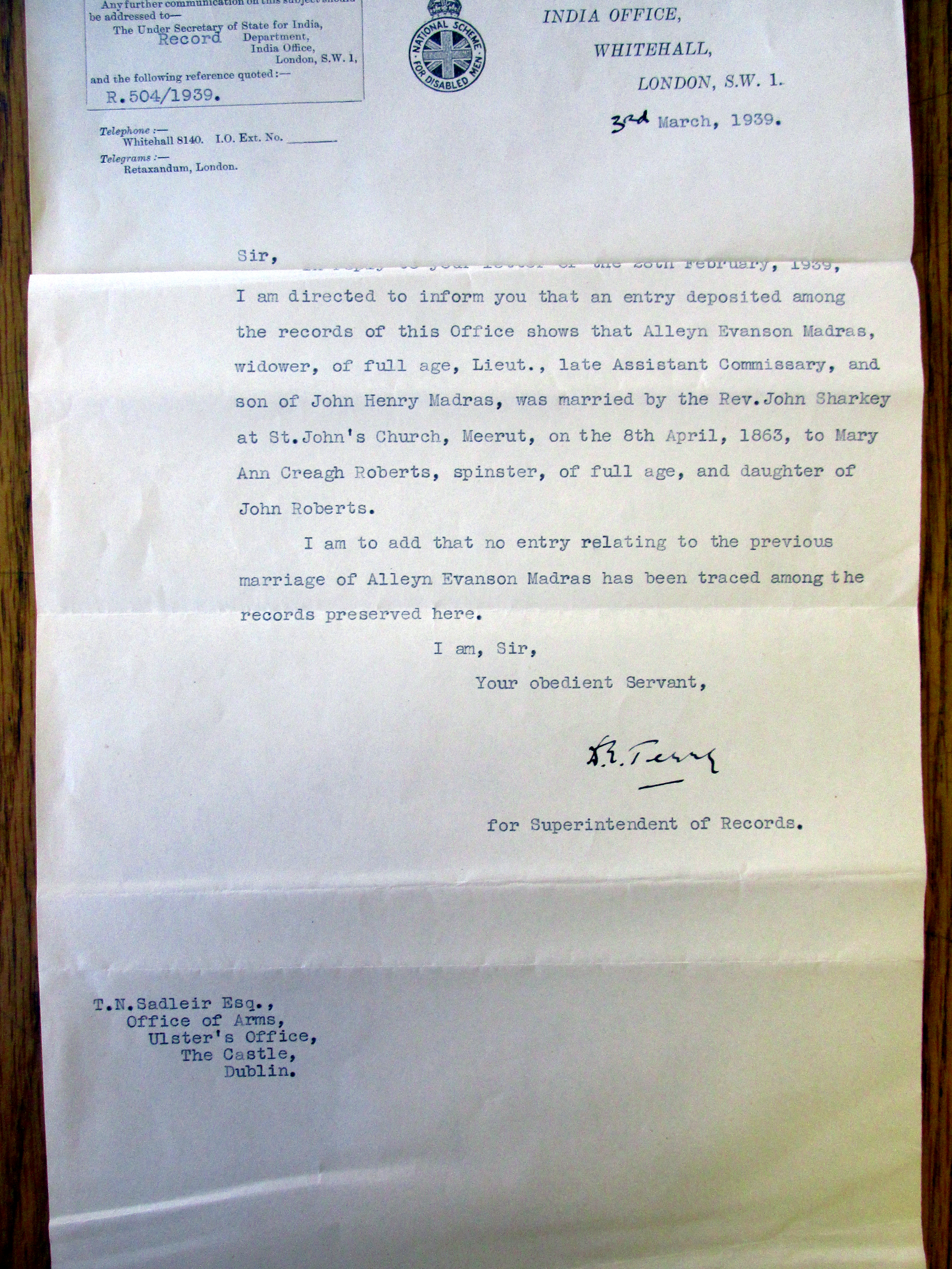 Youngest Son of Madras family mentioned as life also Evansons, Whites of Bantry: