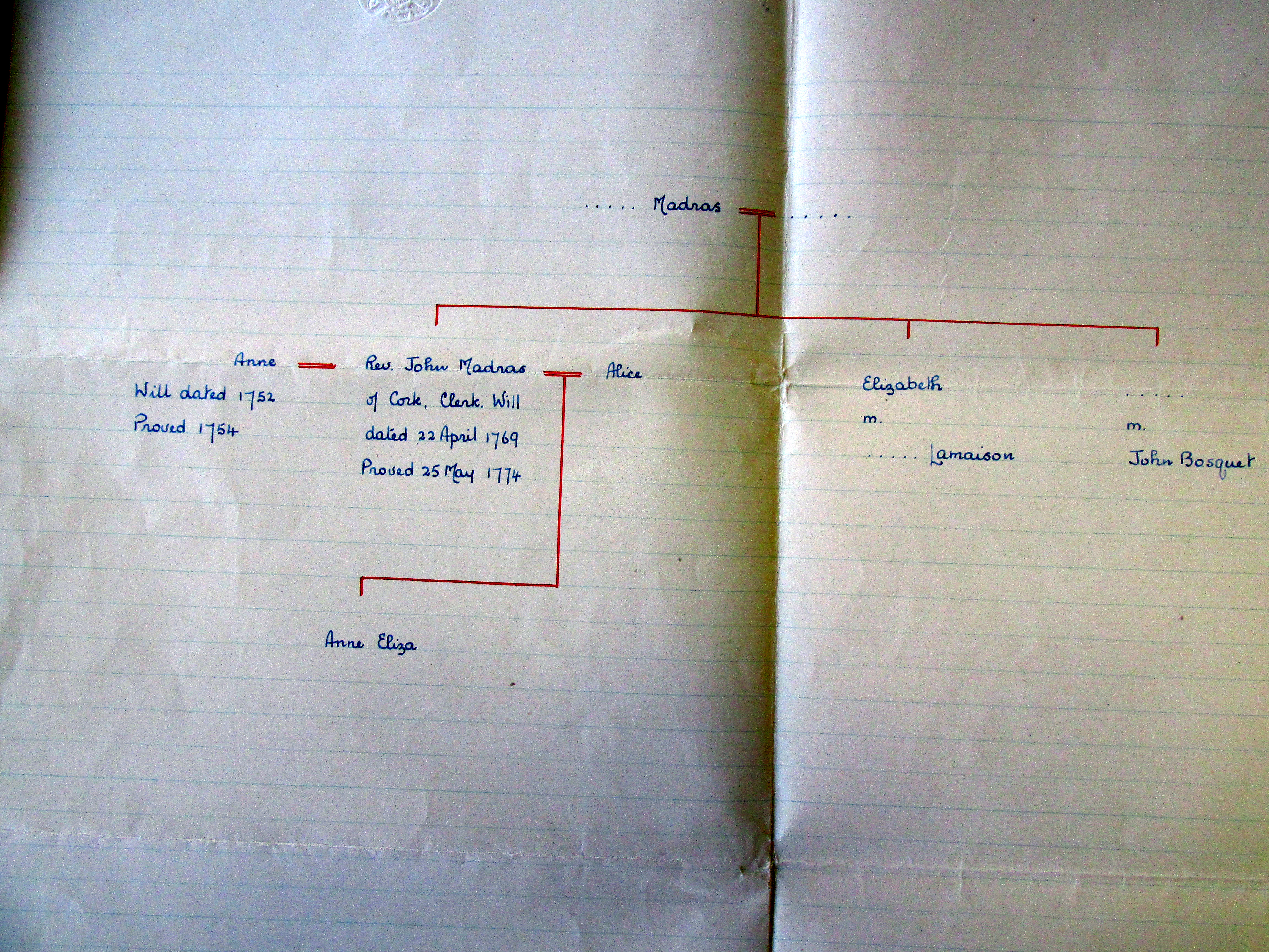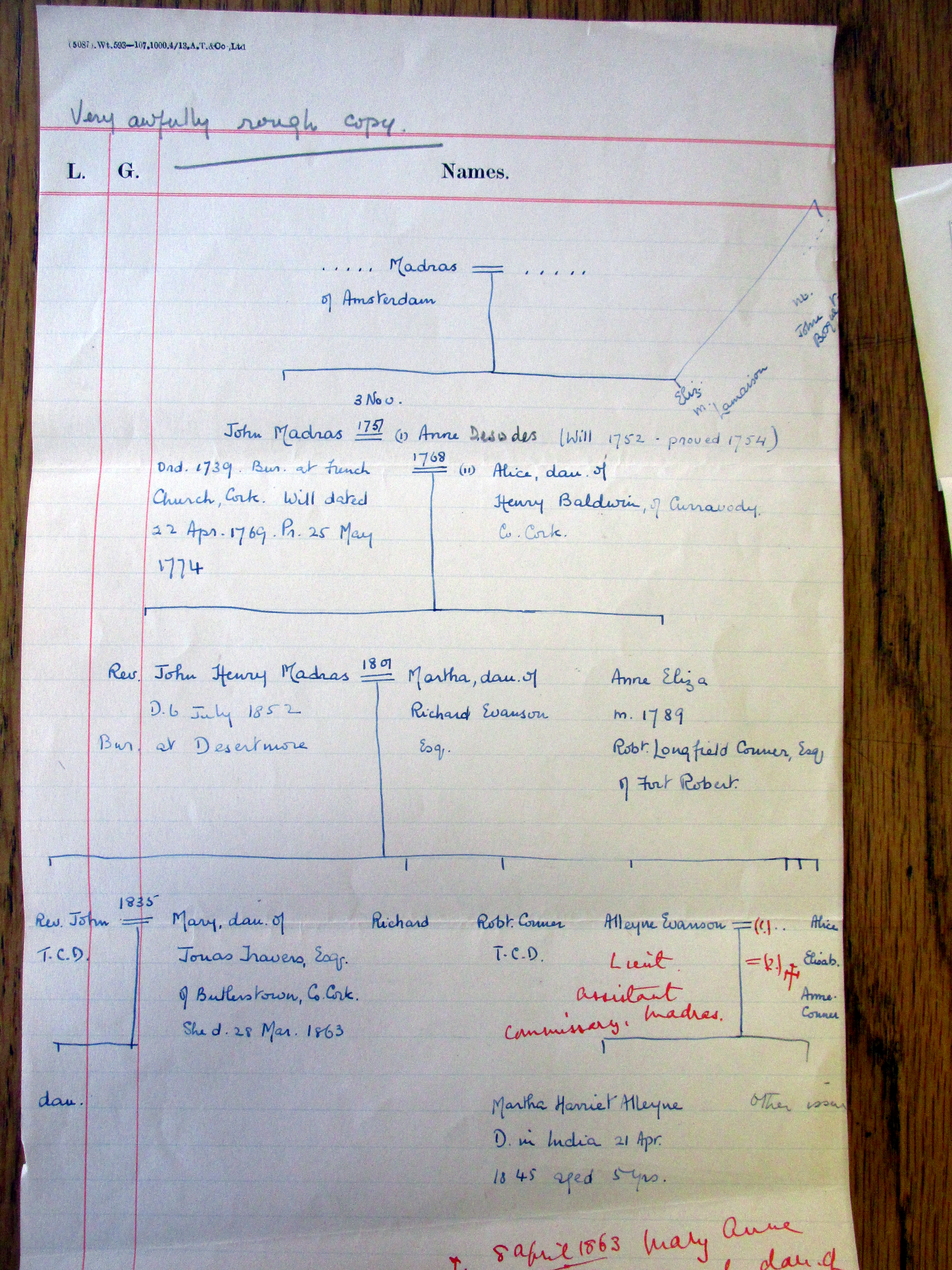 Genealogy of Cork Huguenot Madras family post 1750 from Amsterdam by letter from India Office 1939, interconnected families Longfield Connor Fort Robert, Evanson Durrus, Travers Butlerstown, Baldwin Curravody, Alleyn.