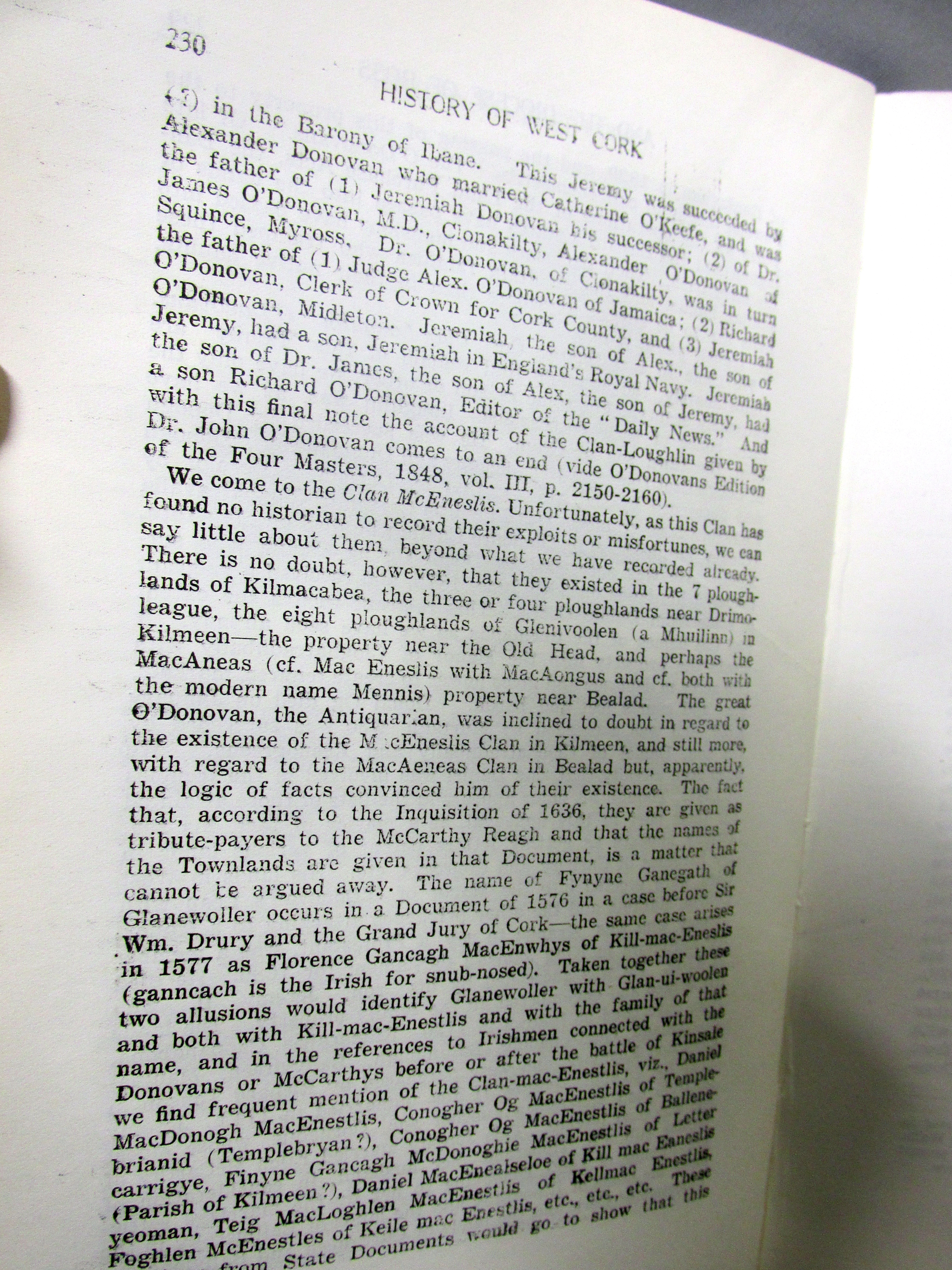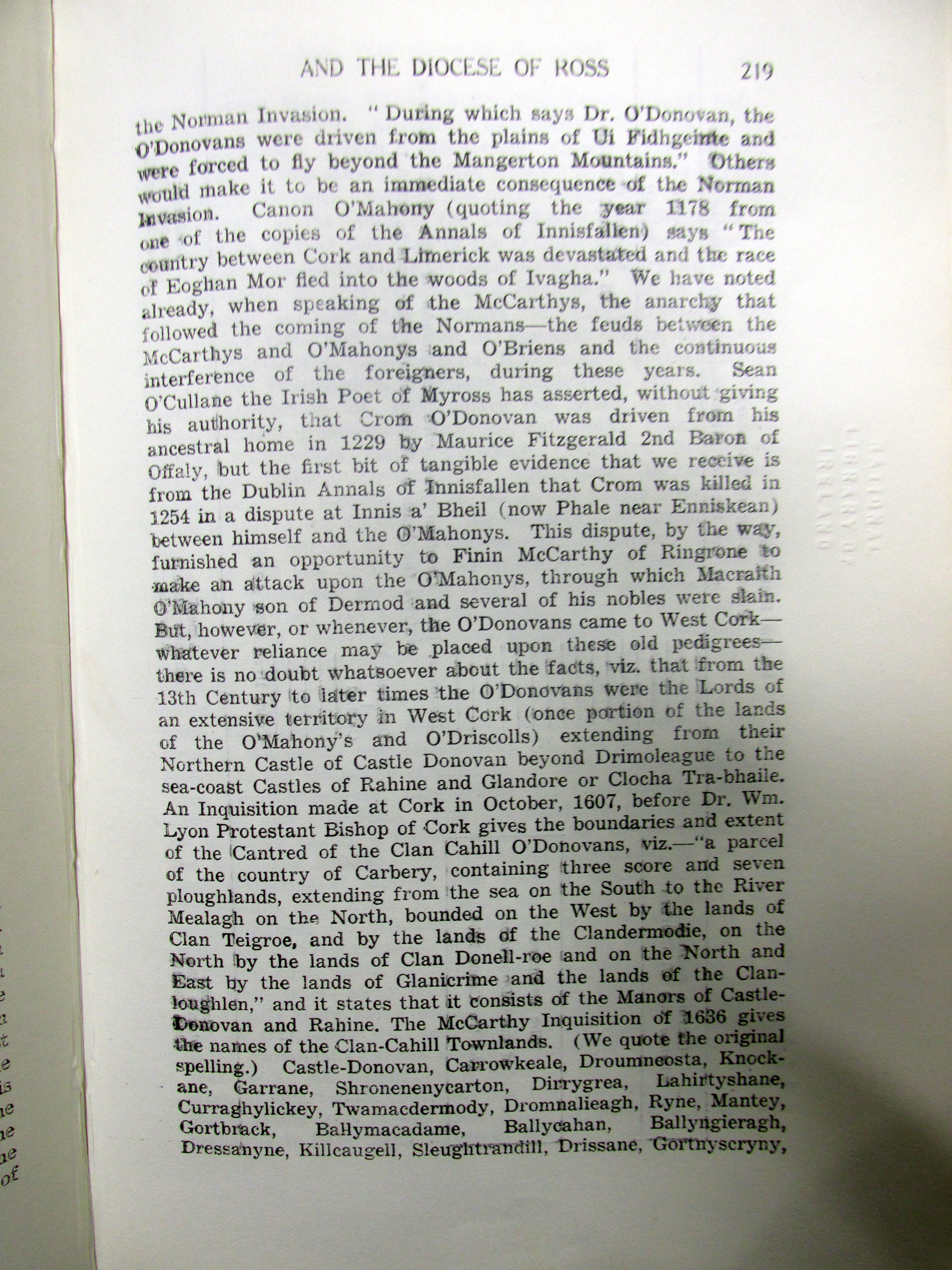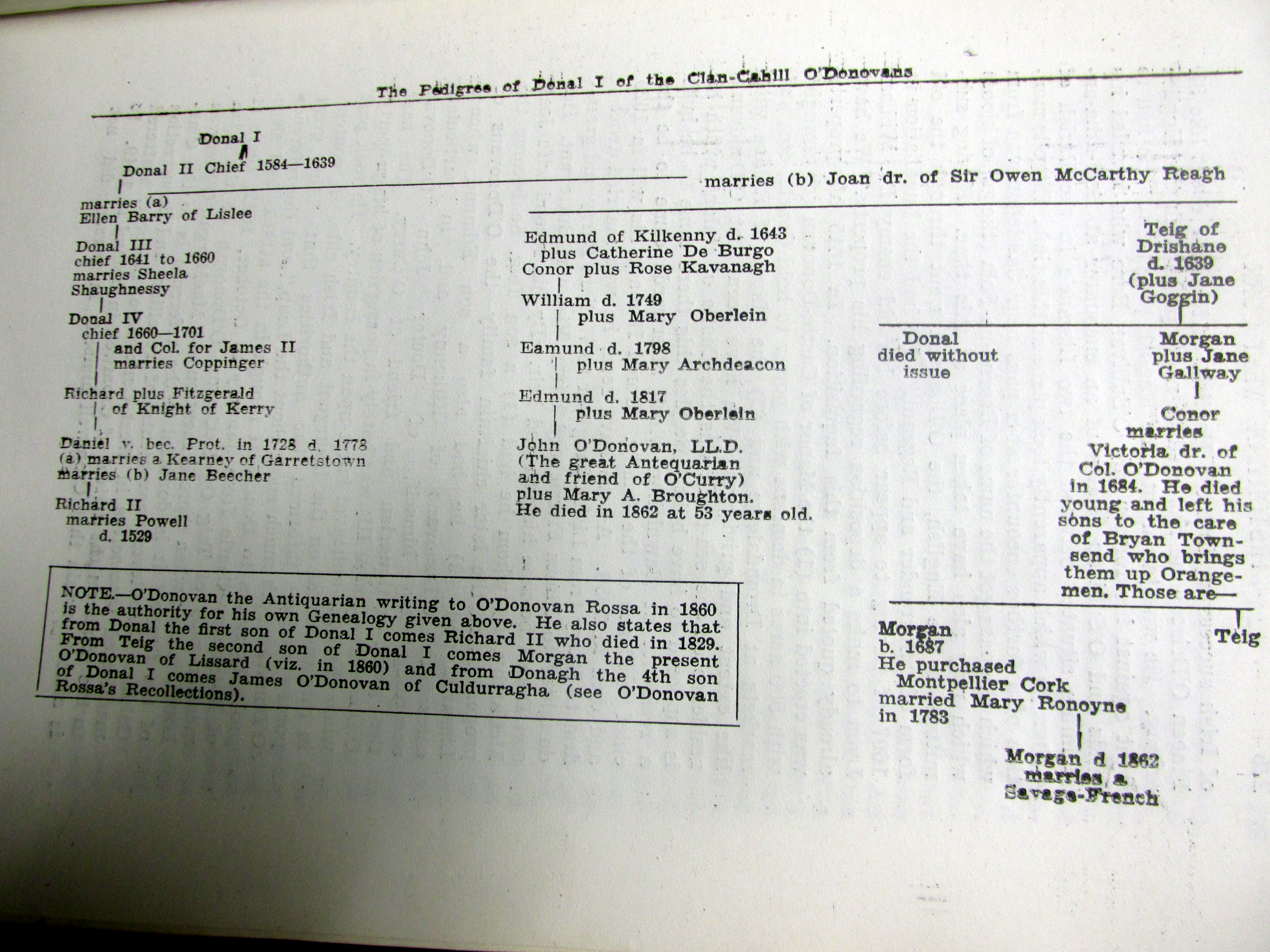 Clan O’Donovan coming to Cork c 1178 AD, Inquisition of 1639 AD setting out extent of Clan-Cahill Townlands, Colonel O’Donovan marries c 1680 died young sons are brought up by Bryan Townsend as ‘Orangemen’, line of Doctor John O’Donovan from West Cork to South Kilkenny Irish scholar, sub-septs of the family, O’Donovan, Skorta, Reenka, Feehane, Killenagh, Blackstaff (Kilcrohane), Driheen, Dearg, Ross, Bawn.