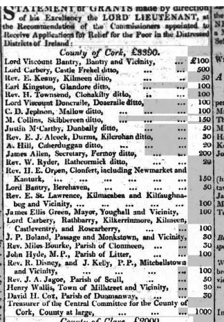 1822. Distress payments by lord Lieutenant to Lord Bantry, Lord Carbery, David H. Cox, Dunmanway, Rev. J.A. Jagoe, Schull, Earl Kingston, Glandore, Rev. Alcock, Durrus.