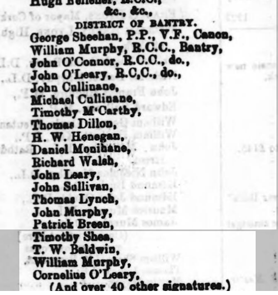 1868. Cork City and County Petition seeking Meeting in Cork For Religious Equality Post Church of Ireland Disestablishment by Parish, Priests, Magistrates, Poor Law Guardians, Lawyers, Doctors, Liberal Protestants, Local Influential Citizens. Request Granted by Lord Fermoy (Roche).