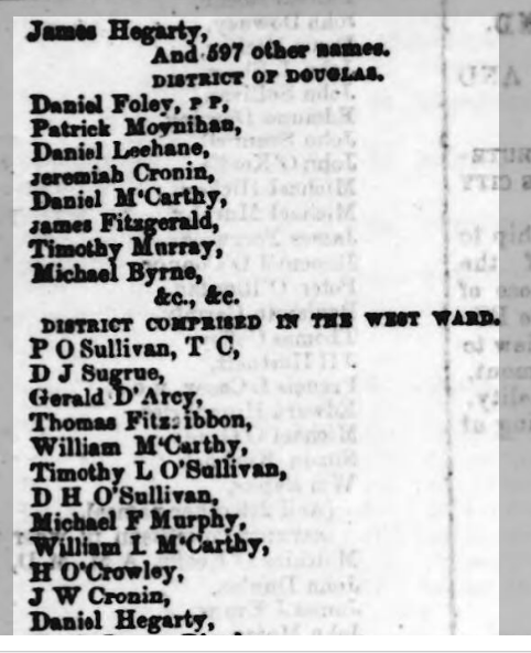 1868. Cork City and County Petition seeking Meeting in Cork For Religious Equality Post Church of Ireland Disestablishment by Parish, Priests, Magistrates, Poor Law Guardians, Lawyers, Doctors, Liberal Protestants, Local Influential Citizens. Request Granted by Lord Fermoy (Roche).