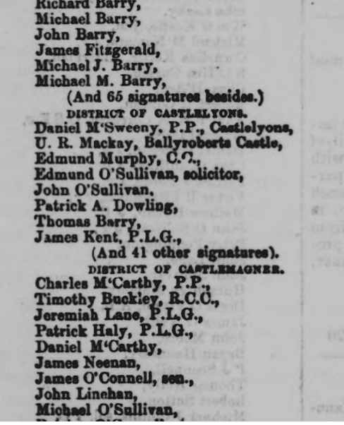 1868. Cork City and County Petition seeking Meeting in Cork For Religious Equality Post Church of Ireland Disestablishment by Parish, Priests, Magistrates, Poor Law Guardians, Lawyers, Doctors, Liberal Protestants, Local Influential Citizens. Request Granted by Lord Fermoy (Roche).