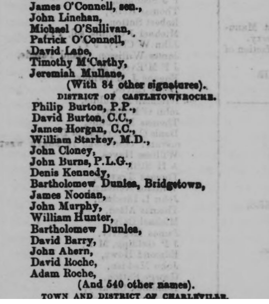 1868. Cork City and County Petition seeking Meeting in Cork For Religious Equality Post Church of Ireland Disestablishment by Parish, Priests, Magistrates, Poor Law Guardians, Lawyers, Doctors, Liberal Protestants, Local Influential Citizens. Request Granted by Lord Fermoy (Roche).