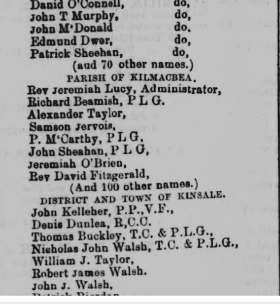 1868. Cork City and County Petition seeking Meeting in Cork For Religious Equality Post Church of Ireland Disestablishment by Parish, Priests, Magistrates, Poor Law Guardians, Lawyers, Doctors, Liberal Protestants, Local Influential Citizens. Request Granted by Lord Fermoy (Roche).