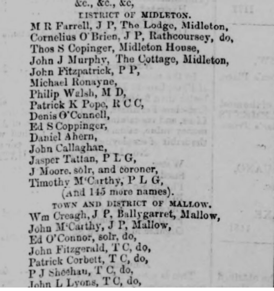 1868. Cork City and County Petition seeking Meeting in Cork For Religious Equality Post Church of Ireland Disestablishment by Parish, Priests, Magistrates, Poor Law Guardians, Lawyers, Doctors, Liberal Protestants, Local Influential Citizens. Request Granted by Lord Fermoy (Roche).