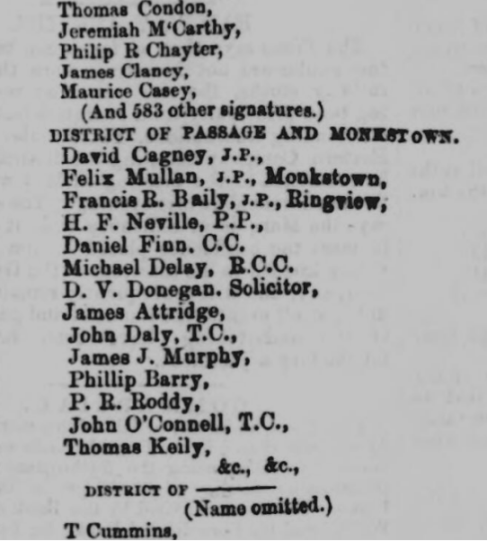 1868. Cork City and County Petition seeking Meeting in Cork For Religious Equality Post Church of Ireland Disestablishment by Parish, Priests, Magistrates, Poor Law Guardians, Lawyers, Doctors, Liberal Protestants, Local Influential Citizens. Request Granted by Lord Fermoy (Roche).