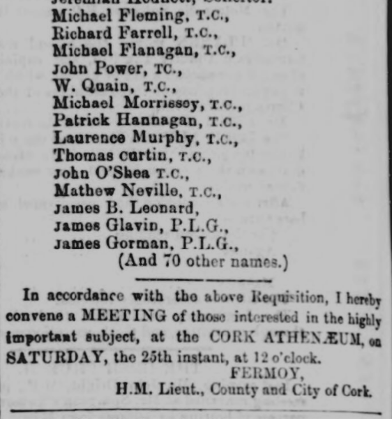 1868. Cork City and County Petition seeking Meeting in Cork For Religious Equality Post Church of Ireland Disestablishment by Parish, Priests, Magistrates, Poor Law Guardians, Lawyers, Doctors, Liberal Protestants, Local Influential Citizens. Request Granted by Lord Fermoy (Roche).