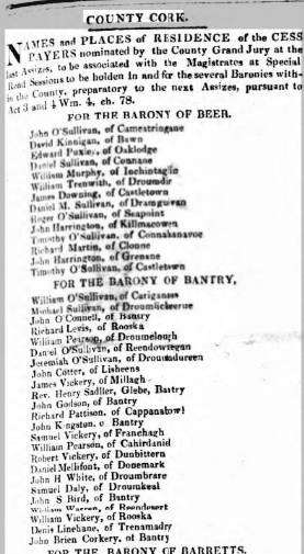1834. Cess Payers Nominated by Grand Jury, Baronies of Carbery, Bantry and Bere, West Cork and Bad Cess to You. 06 Wednesday Jul 2016 Original size at 277 × 505 ≈ Leave a comment