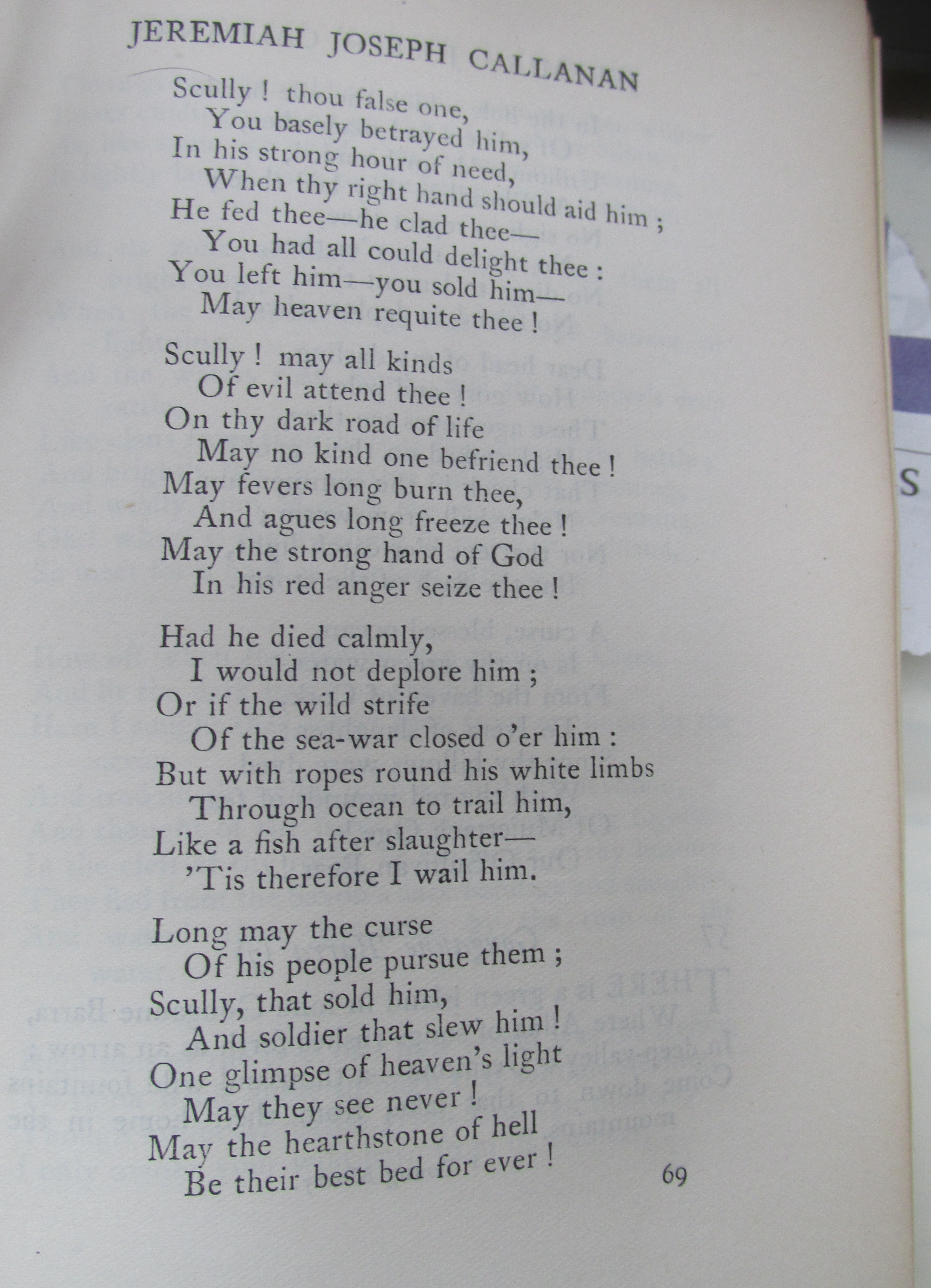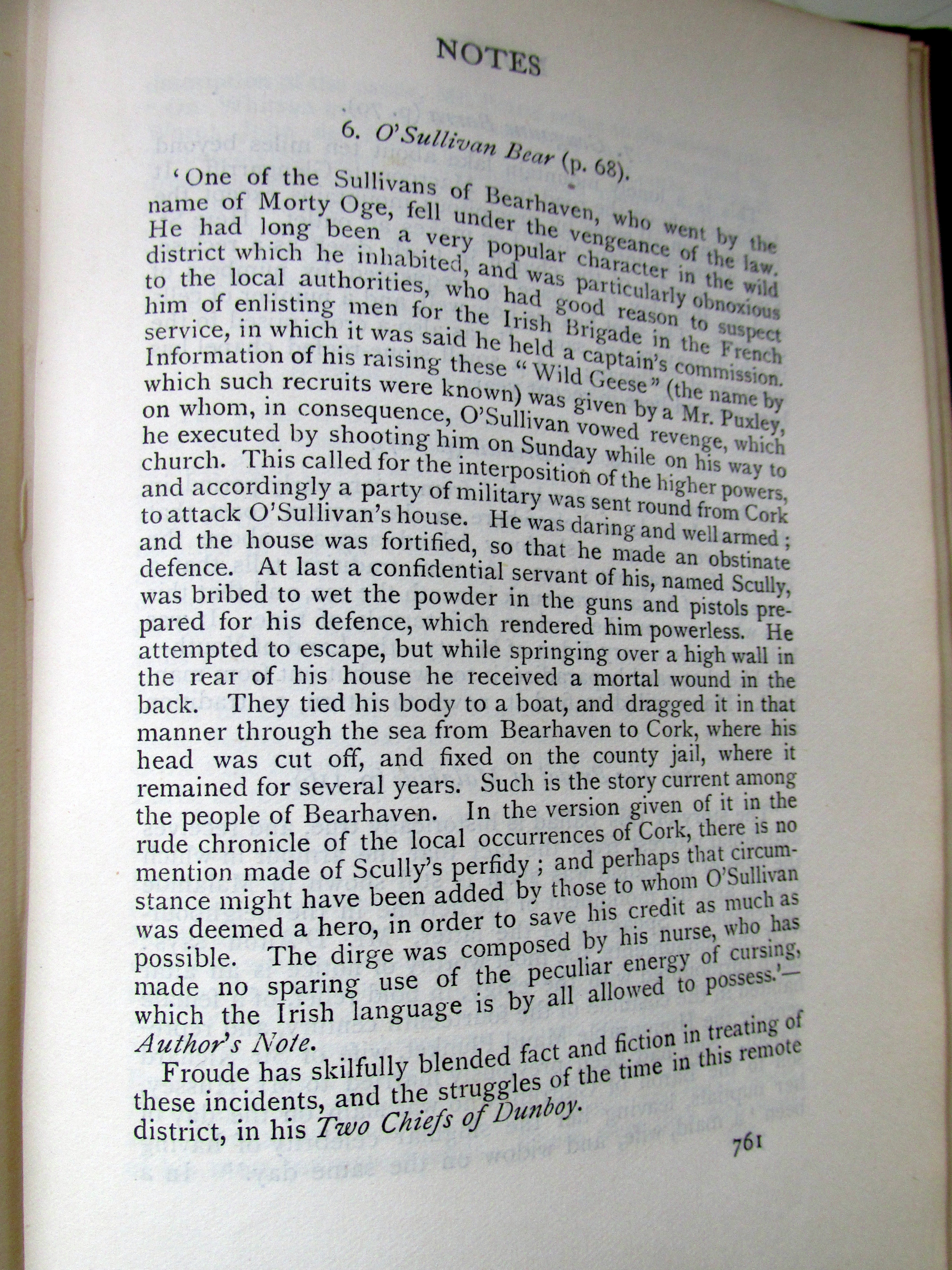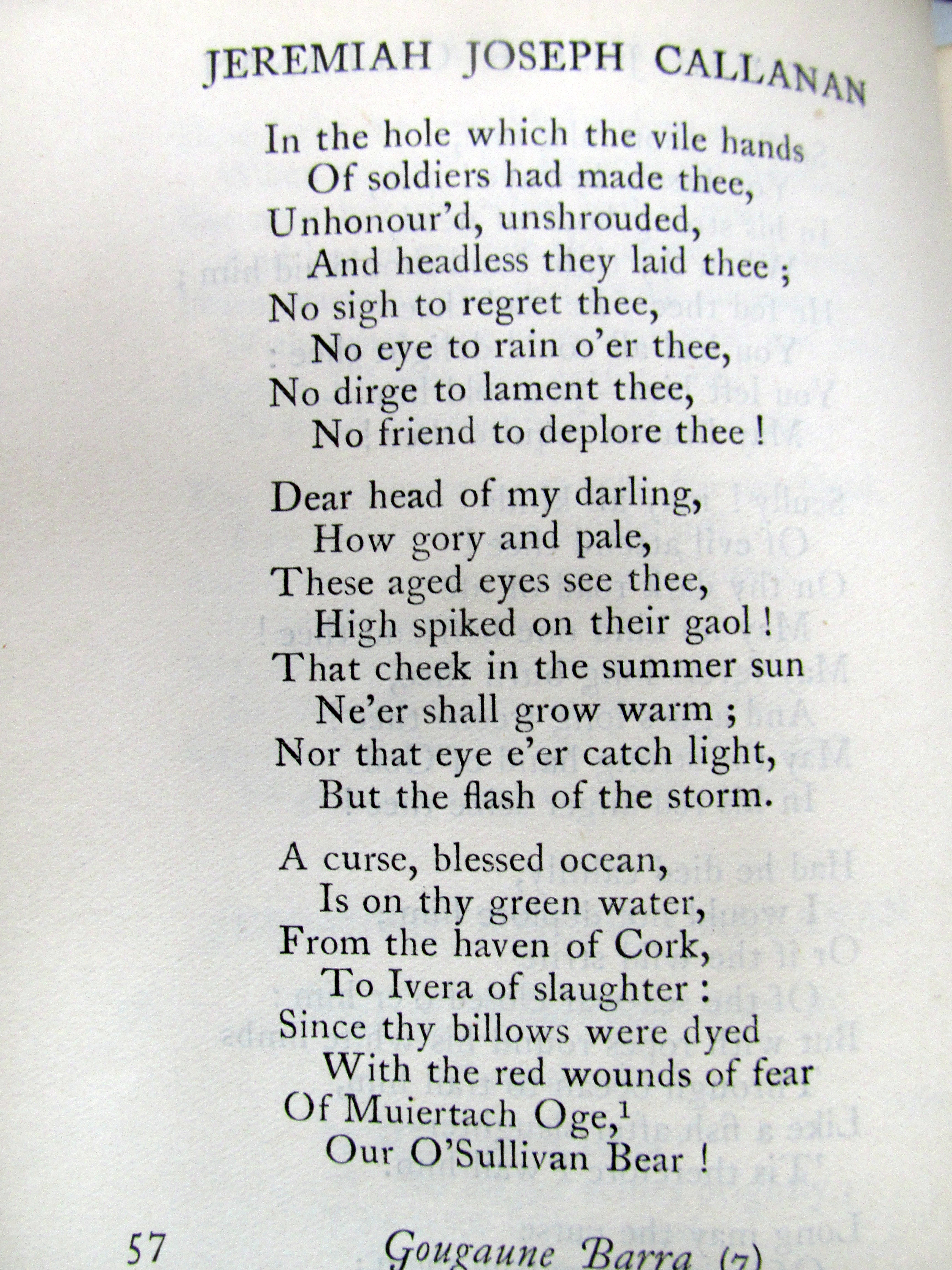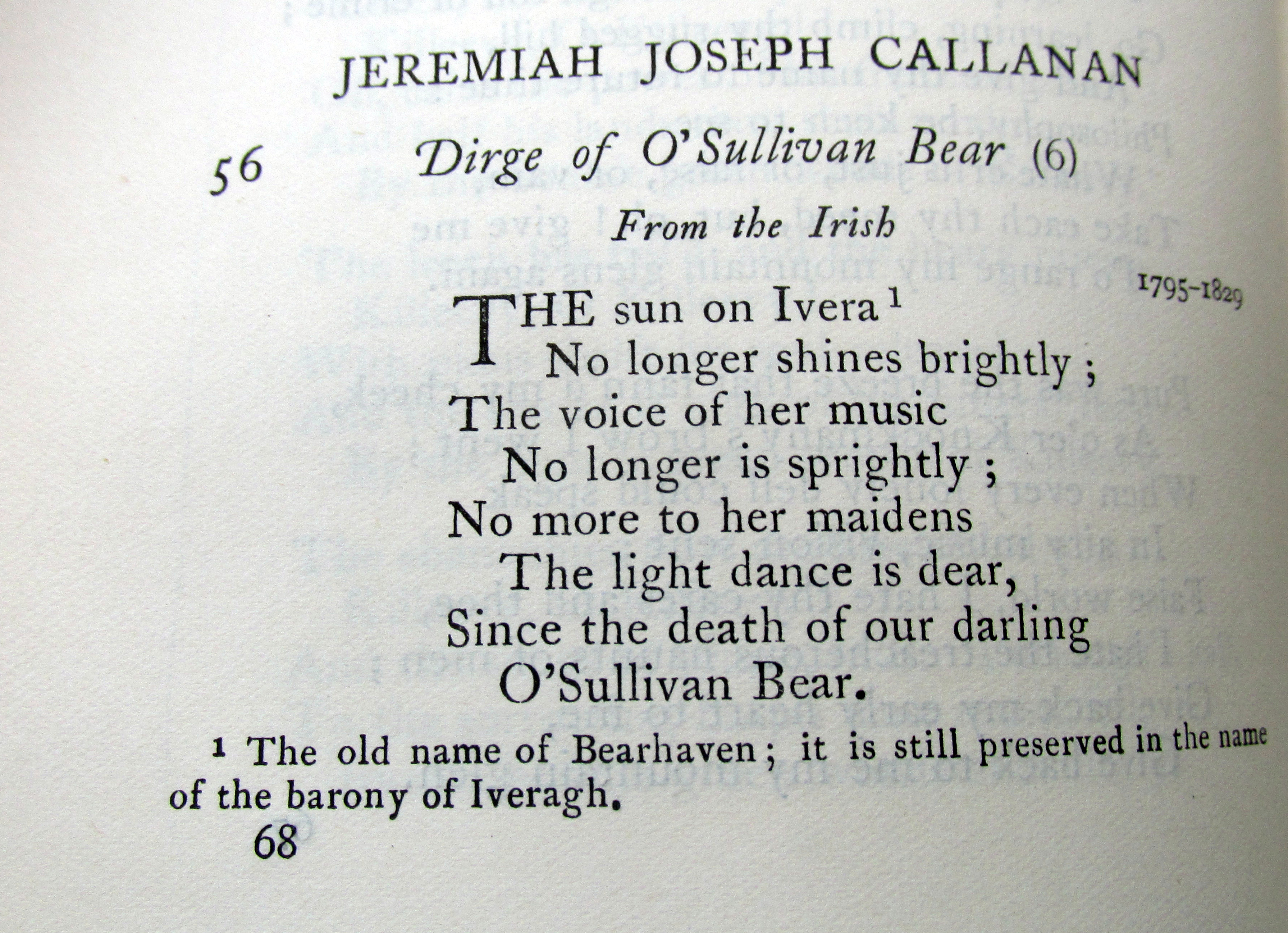 Dirge of Murty Óg O’Sullivan Bere, composed in Irish by his nurse translated by Jeremiah Joseph Callanan, Murty killed John Puxley in turn he was betrayed by his servant Scully, killed, his body dragged by boat from Berehaven to Cork beheaded and his head lay for years on Cork Jail.