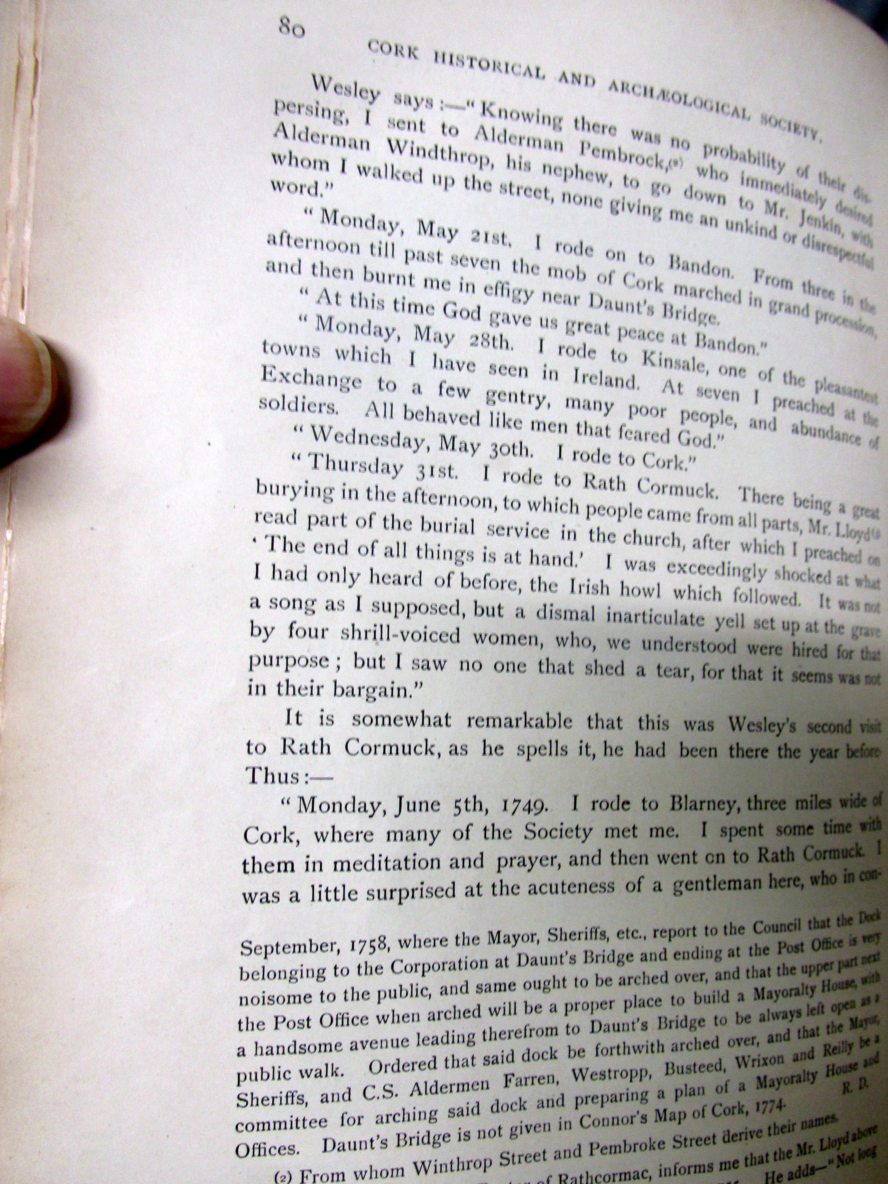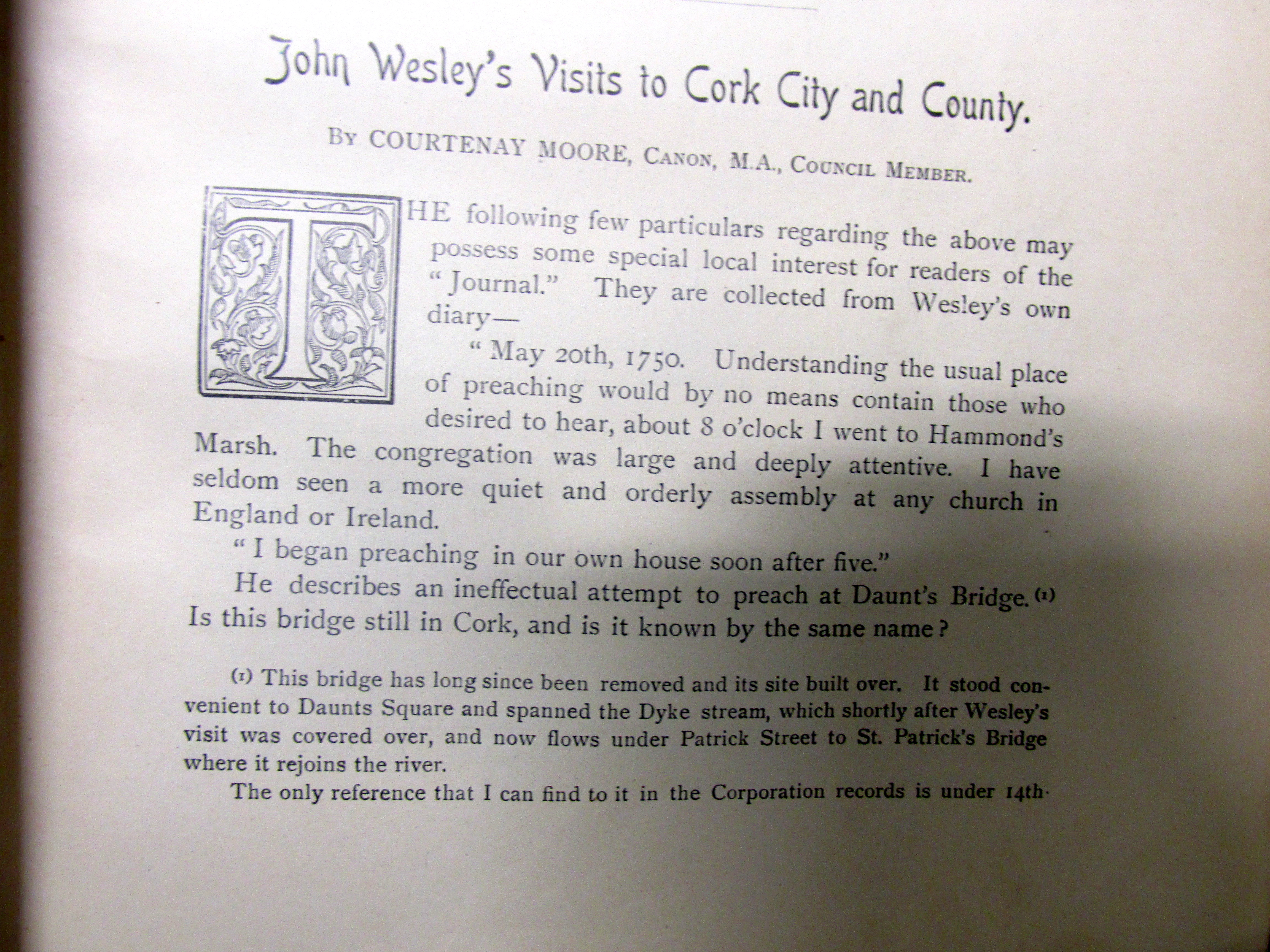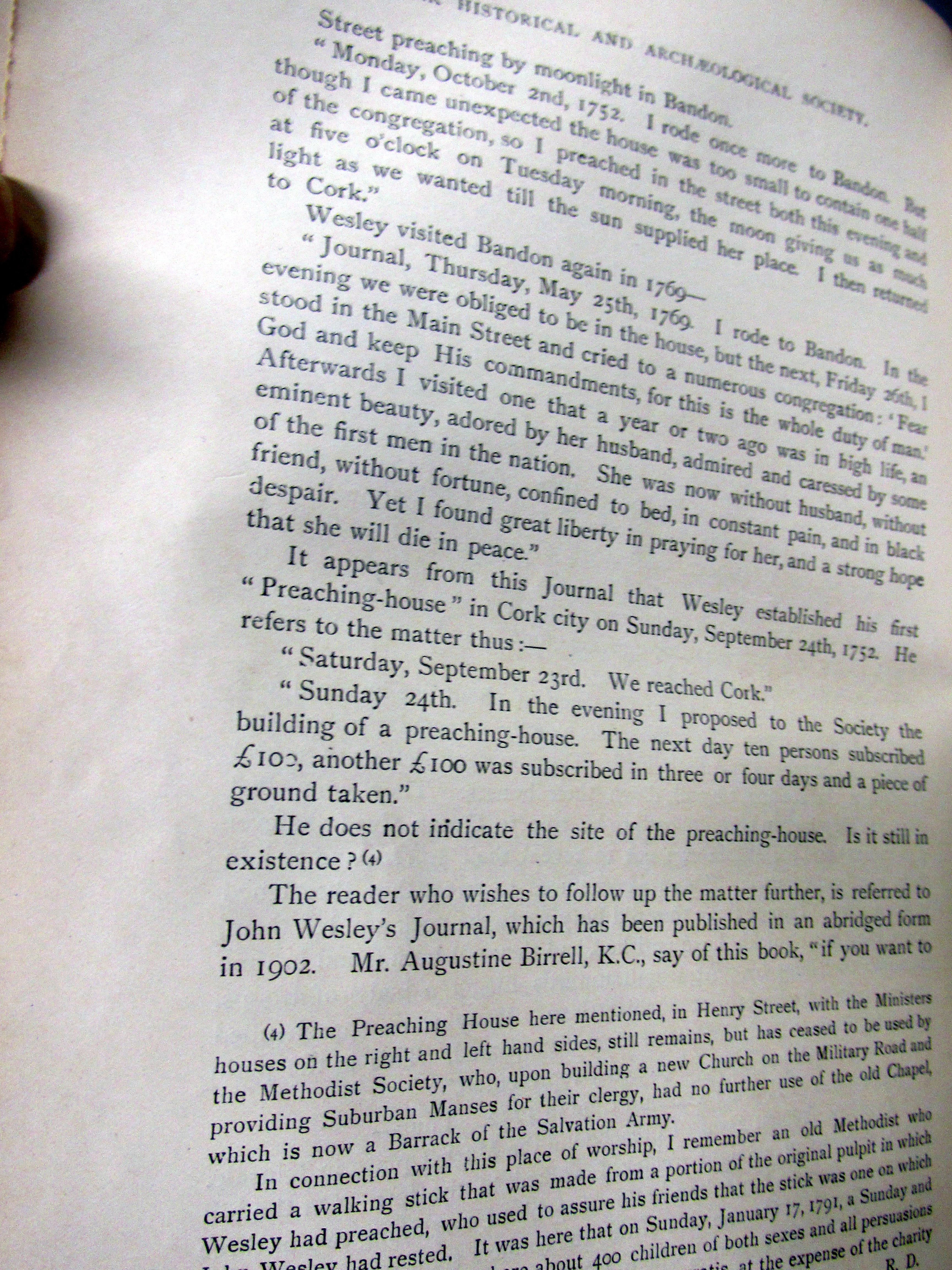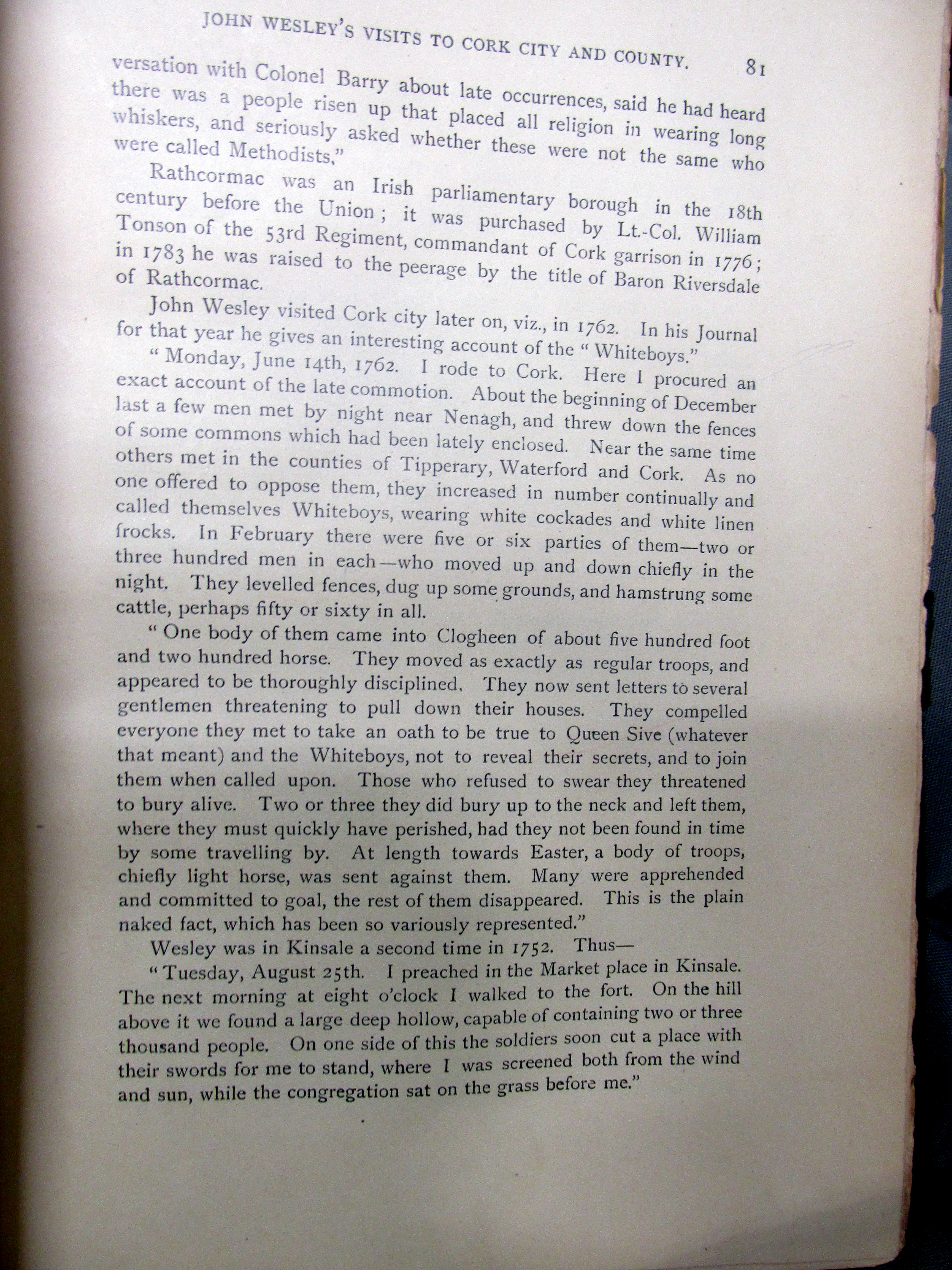 John Wesley’s Cork Visitations, 1750, 1752, 1762, including Bandon, Kinsale, meeting Whiteboys and their Oath to Queen Sive and overview of Methodism in West Cork.