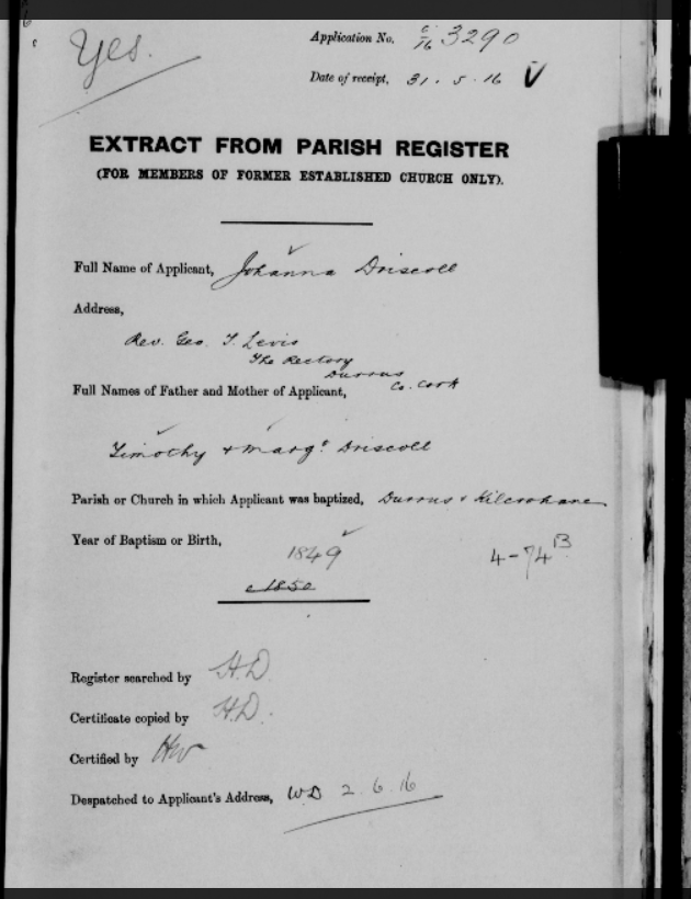Church of Ireland Search Forms for Old Age Pensions, from Durrus, West Cork. Parish Register and Extracts from Census of 1840s, 1850s, 1860s all Lost in Destruction of Public Records Office, Dublin, 1922. Names include Allen, Baker, Croston, Driscoll, Dukelow, Manders, Shannon, Sullivan, Varian, Williamson