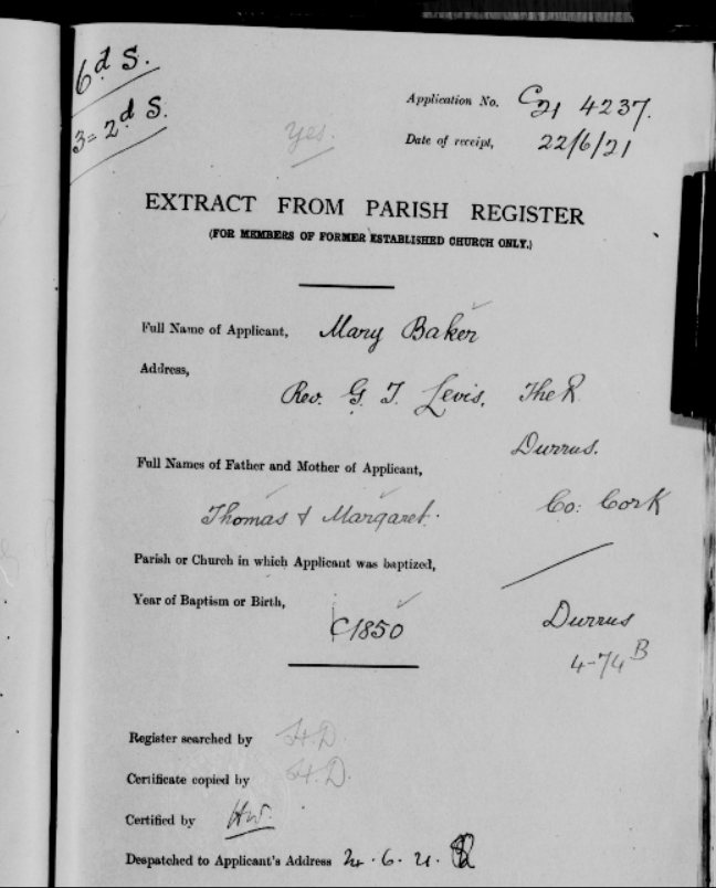 Church of Ireland Search Forms for Old Age Pensions, from Durrus, West Cork. Parish Register and Extracts from Census of 1840s, 1850s, 1860s all Lost in Destruction of Public Records Office, Dublin, 1922. Names include Allen, Baker, Croston, Driscoll, Dukelow, Manders, Shannon, Sullivan, Varian, Williamson