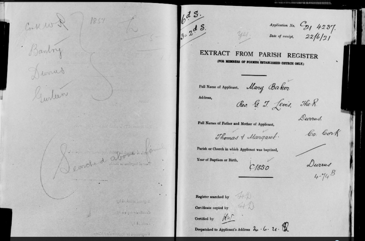 Church of Ireland Search Forms for Old Age Pensions, from Durrus, West Cork. Parish Register and Extracts from Census of 1840s, 1850s, 1860s all Lost in Destruction of Public Records Office, Dublin, 1922. Names include Allen, Baker, Croston, Driscoll, Dukelow, Manders, Shannon, Sullivan, Varian, Williamson