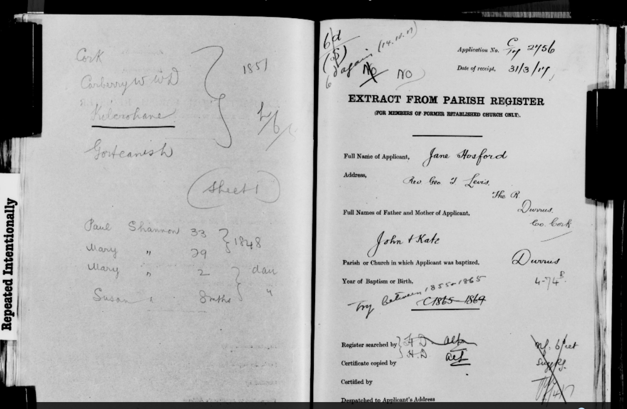 Church of Ireland Search Forms for Old Age Pensions, from Durrus, West Cork. Parish Register and Extracts from Census of 1840s, 1850s, 1860s all Lost in Destruction of Public Records Office, Dublin, 1922. Names include Allen, Baker, Croston, Driscoll, Dukelow, Manders, Shannon, Sullivan, Varian, Williamson