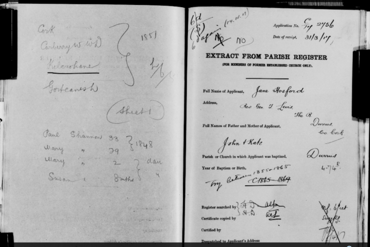 Church of Ireland Search Forms for Old Age Pensions, from Durrus, West Cork. Parish Register and Extracts from Census of 1840s, 1850s, 1860s all Lost in Destruction of Public Records Office, Dublin, 1922. Names include Allen, Baker, Croston, Driscoll, Dukelow, Manders, Shannon, Sullivan, Varian, Williamson