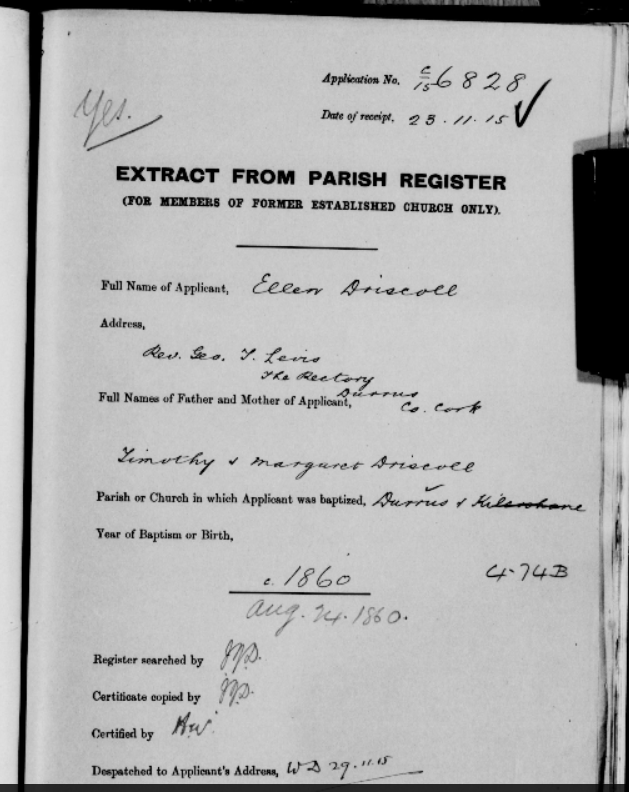 Church of Ireland Search Forms for Old Age Pensions, from Durrus, West Cork. Parish Register and Extracts from Census of 1840s, 1850s, 1860s all Lost in Destruction of Public Records Office, Dublin, 1922. Names include Allen, Baker, Croston, Driscoll, Dukelow, Manders, Shannon, Sullivan, Varian, Williamson