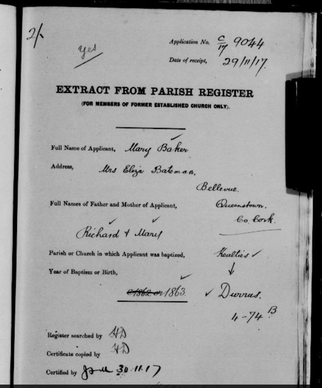 Church of Ireland Search Forms for Old Age Pensions, from Durrus, West Cork. Parish Register and Extracts from Census of 1840s, 1850s, 1860s all Lost in Destruction of Public Records Office, Dublin, 1922. Names include Allen, Baker, Croston, Driscoll, Dukelow, Manders, Shannon, Sullivan, Varian, Williamson