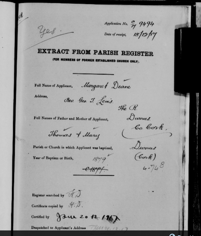 Church of Ireland Search Forms for Old Age Pensions, from Durrus, West Cork. Parish Register and Extracts from Census of 1840s, 1850s, 1860s all Lost in Destruction of Public Records Office, Dublin, 1922. Names include Allen, Baker, Croston, Driscoll, Dukelow, Manders, Shannon, Sullivan, Varian, Williamson