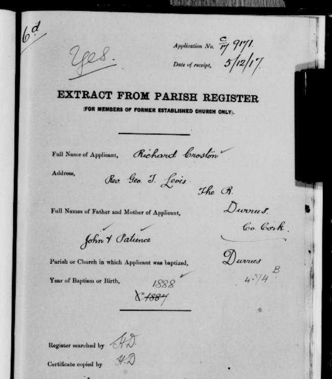 Church of Ireland Search Forms for Old Age Pensions, from Durrus, West Cork. Parish Register and Extracts from Census of 1840s, 1850s, 1860s all Lost in Destruction of Public Records Office, Dublin, 1922. Names include Allen, Baker, Croston, Driscoll, Dukelow, Manders, Shannon, Sullivan, Varian, Williamson