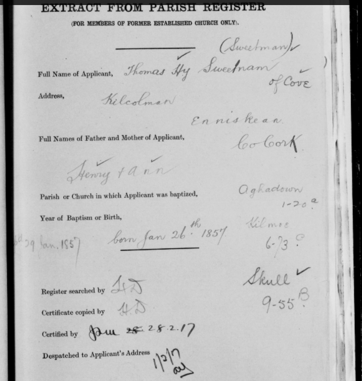 Pre 1922 from Records Destroyed in Public Records Office, Dublin, Pension Enquiry Forms, Schull District, West Cork. Names include, Blatchford, Brooks, Cole, Courtenay, Gallagher, Humphreys, Landers, Levis, King, Newman, Roycroft including 1851 Census, Skuse, Swanton