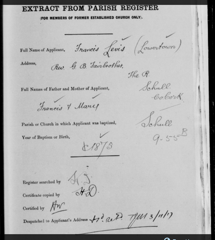 Pre 1922 from Records Destroyed in Public Records Office, Dublin, Pension Enquiry Forms, Schull District, West Cork. Names include, Blatchford, Brooks, Cole, Courtenay, Gallagher, Humphreys, Landers, Levis, King, Newman, Roycroft including 1851 Census, Skuse, Swanton